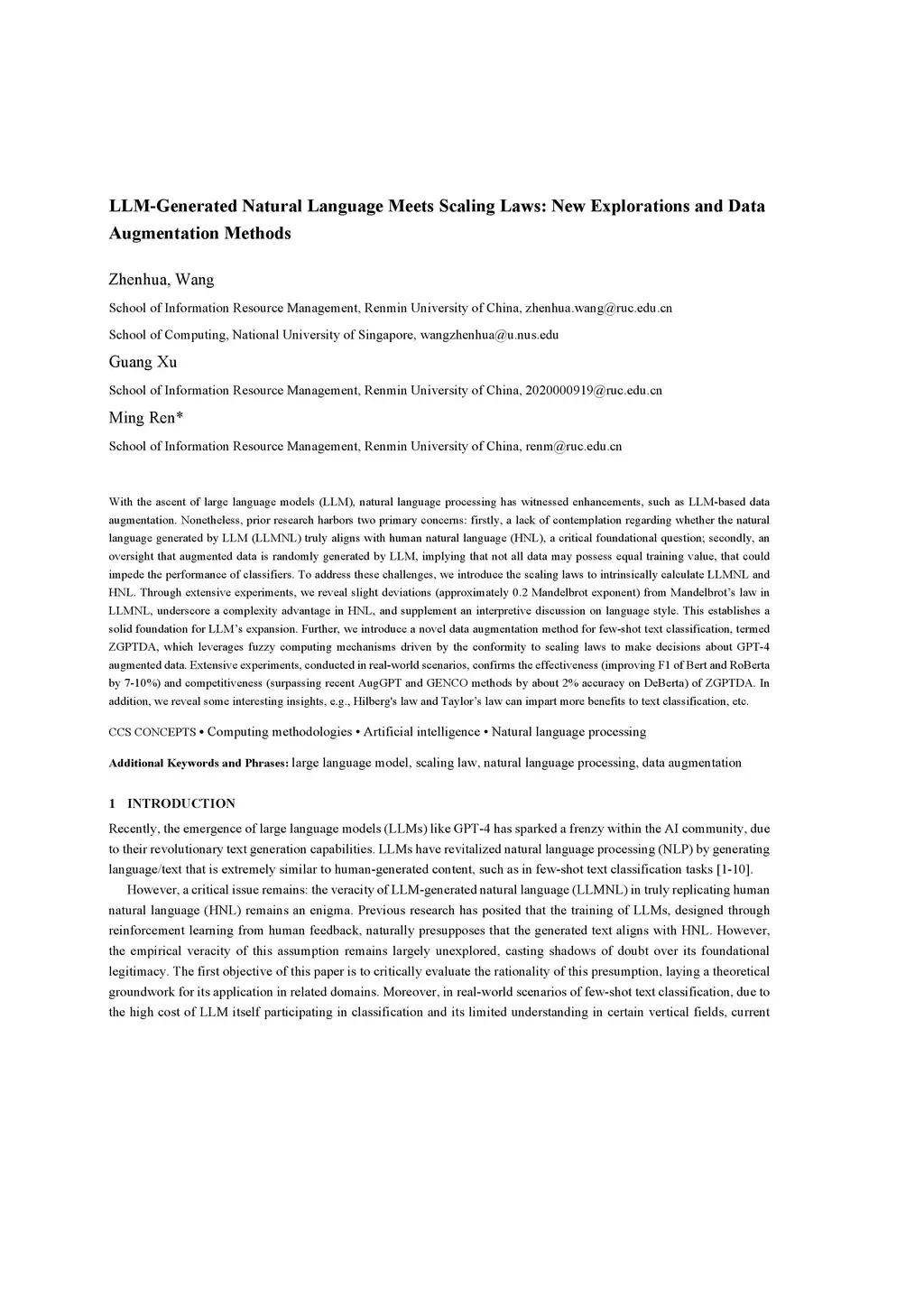 With the ascent of large language models (LLM), natural language processing has witnessed enhancements, such as LLM-based data augmentation. Nonetheless, prior research harbors two primary concerns: firstly, a lack of contemplation regarding whether the natural language generated by LLM (LLMNL) truly aligns with human natural language (HNL), a critical foundational question; secondly, an oversight that augmented data is randomly generated by LLM, implying that not all data may possess equal training value, that could impede the performance of classifiers. To address these challenges, we introduce the scaling laws to intrinsically calculate LLMNL and HNL. Through extensive experiments, we reveal slight deviations (approximately 0.2 Mandelbrot exponent) from Mandelbrot's law in LLMNL, underscore a complexity advantage in HNL, and supplement an interpretive discussion on language style. This establishes a solid foundation for LLM's expansion. Further, we introduce a novel data augmentation method for few-shot text classification, termed ZGPTDA, which leverages fuzzy computing mechanisms driven by the conformity to scaling laws to make decisions about GPT-4 augmented data. Extensive experiments, conducted in real-world scenarios, confirms the effectiveness (improving F1 of Bert and RoBerta by 7-10%) and competitiveness (surpassing recent AugGPT and GENCO methods by about 2% accuracy on DeBerta) of ZGPTDA. In addition, we reveal some interesting insights, e.g., Hilberg's law and Taylor's law can impart more benefits to text classification, etc.