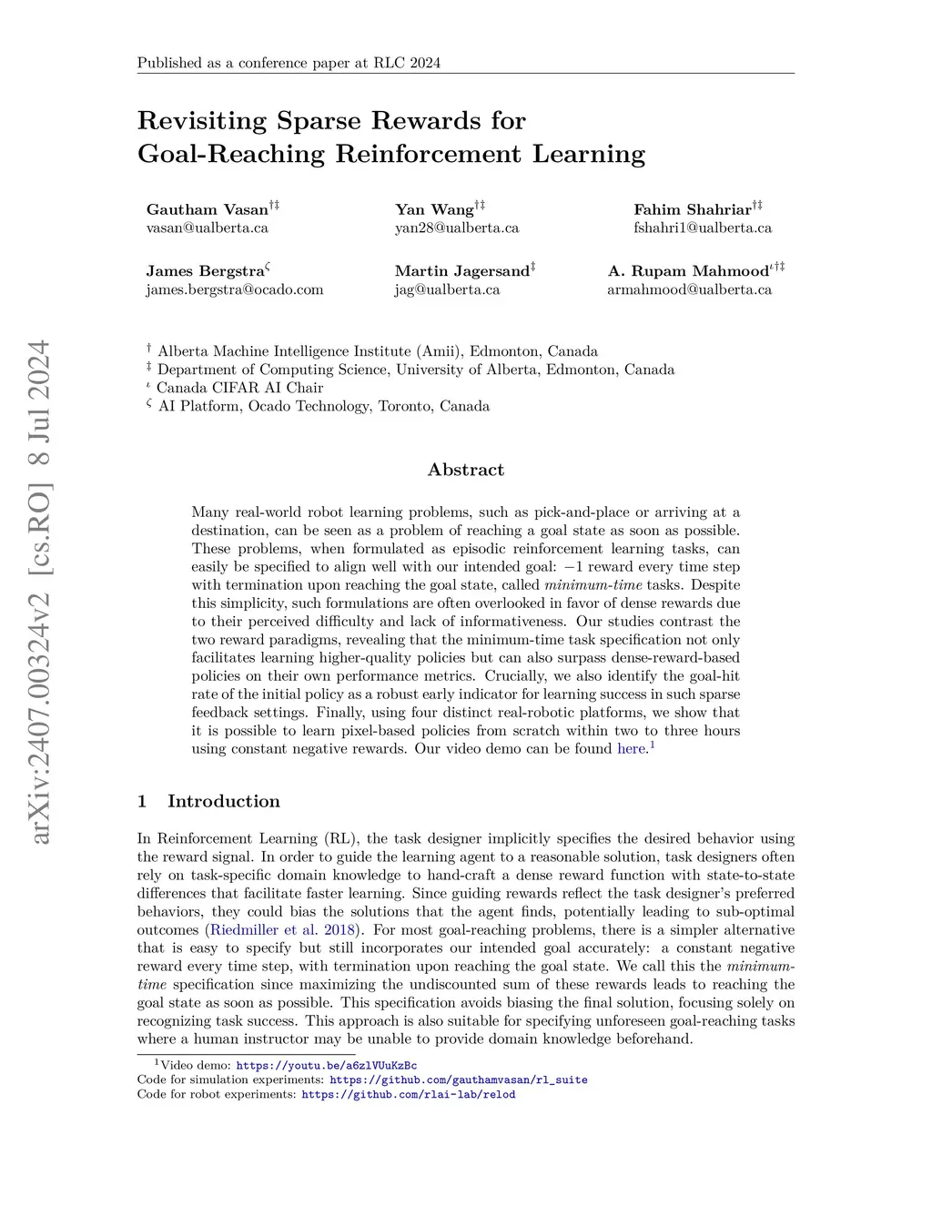 Many real-world robot learning problems, such as pick-and-place or arriving at a destination, can be seen as a problem of reaching a goal state as soon as possible. These problems, when formulated as episodic reinforcement learning tasks, can easily be specified to align well with our intended goal: -1 reward every time step with termination upon reaching the goal state, called minimum-time tasks. Despite this simplicity, such formulations are often overlooked in favor of dense rewards due to their perceived difficulty and lack of informativeness. Our studies contrast the two reward paradigms, revealing that the minimum-time task specification not only facilitates learning higher-quality policies but can also surpass dense-reward-based policies on their own performance metrics. Crucially, we also identify the goal-hit rate of the initial policy as a robust early indicator for learning success in such sparse feedback settings. Finally, using four distinct real-robotic platforms, we show that it is possible to learn pixel-based policies from scratch within two to three hours using constant negative rewards.