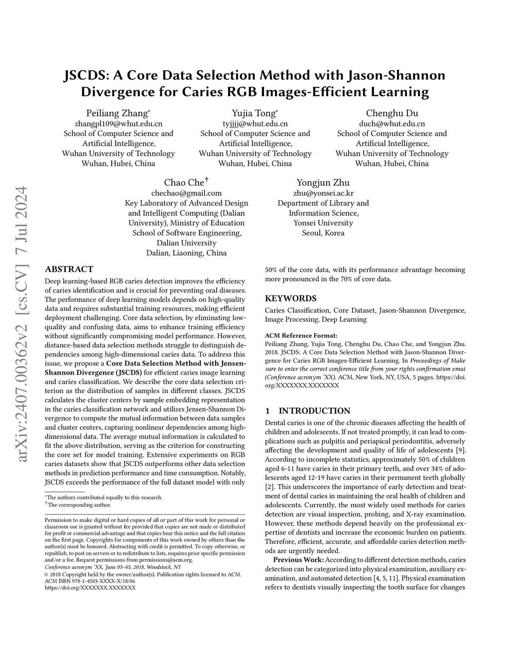 Deep learning-based RGB caries detection improves the efficiency of caries identification and is crucial for preventing oral diseases. The performance of deep learning models depends on high-quality data and requires substantial training resources, making efficient deployment challenging. Core data selection, by eliminating low-quality and confusing data, aims to enhance training efficiency without significantly compromising model performance. However, distance-based data selection methods struggle to distinguish dependencies among high-dimensional caries data. To address this issue, we propose a Core Data Selection Method with Jensen-Shannon Divergence (JSCDS) for efficient caries image learning and caries classification. We describe the core data selection criterion as the distribution of samples in different classes. JSCDS calculates the cluster centers by sample embedding representation in the caries classification network and utilizes Jensen-Shannon Divergence to compute the mutual information between data samples and cluster centers, capturing nonlinear dependencies among high-dimensional data. The average mutual information is calculated to fit the above distribution, serving as the criterion for constructing the core set for model training. Extensive experiments on RGB caries datasets show that JSCDS outperforms other data selection methods in prediction performance and time consumption. Notably, JSCDS exceeds the performance of the full dataset model with only 50% of the core data, with its performance advantage becoming more pronounced in the 70% of core data.