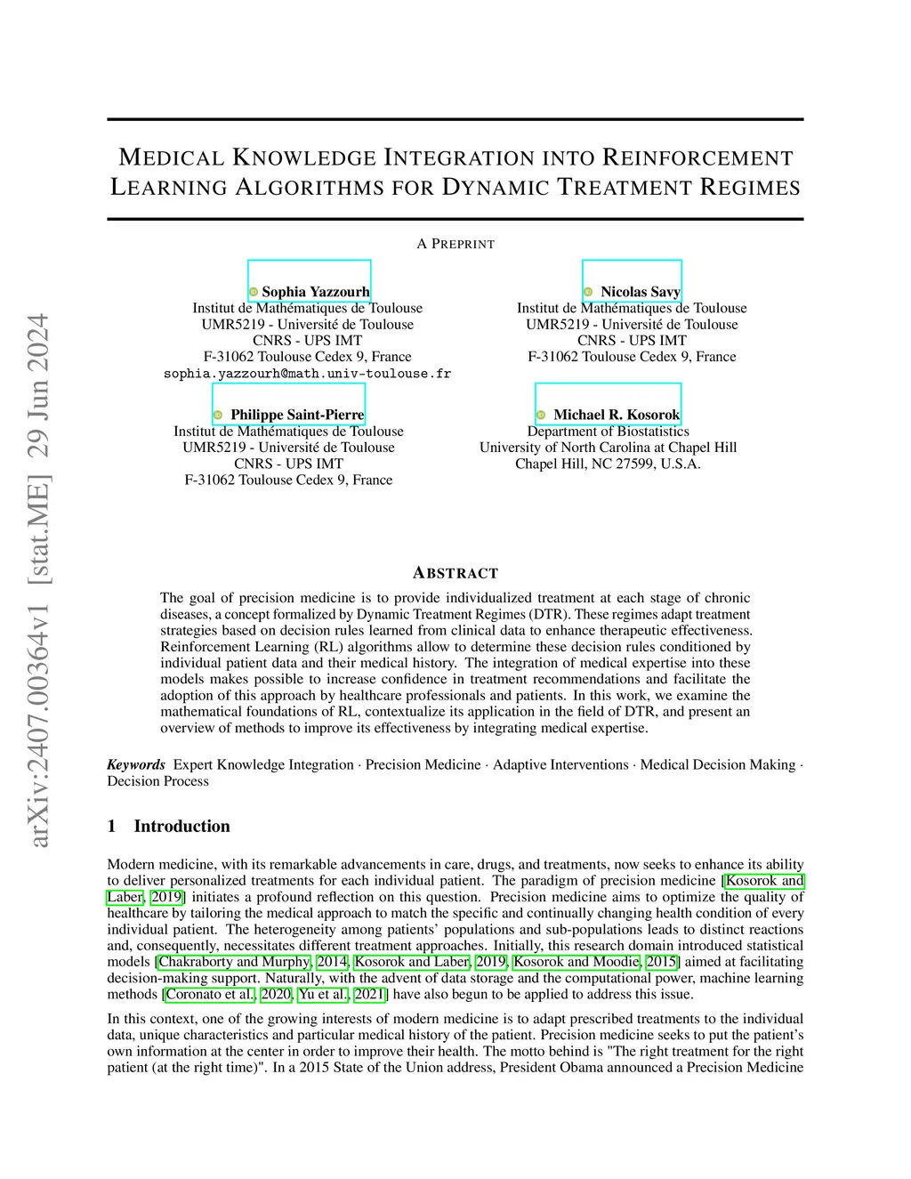 The goal of precision medicine is to provide individualized treatment at each stage of chronic diseases, a concept formalized by Dynamic Treatment Regimes (DTR). These regimes adapt treatment strategies based on decision rules learned from clinical data to enhance therapeutic effectiveness. Reinforcement Learning (RL) algorithms allow to determine these decision rules conditioned by individual patient data and their medical history. The integration of medical expertise into these models makes possible to increase confidence in treatment recommendations and facilitate the adoption of this approach by healthcare professionals and patients. In this work, we examine the mathematical foundations of RL, contextualize its application in the field of DTR, and present an overview of methods to improve its effectiveness by integrating medical expertise.