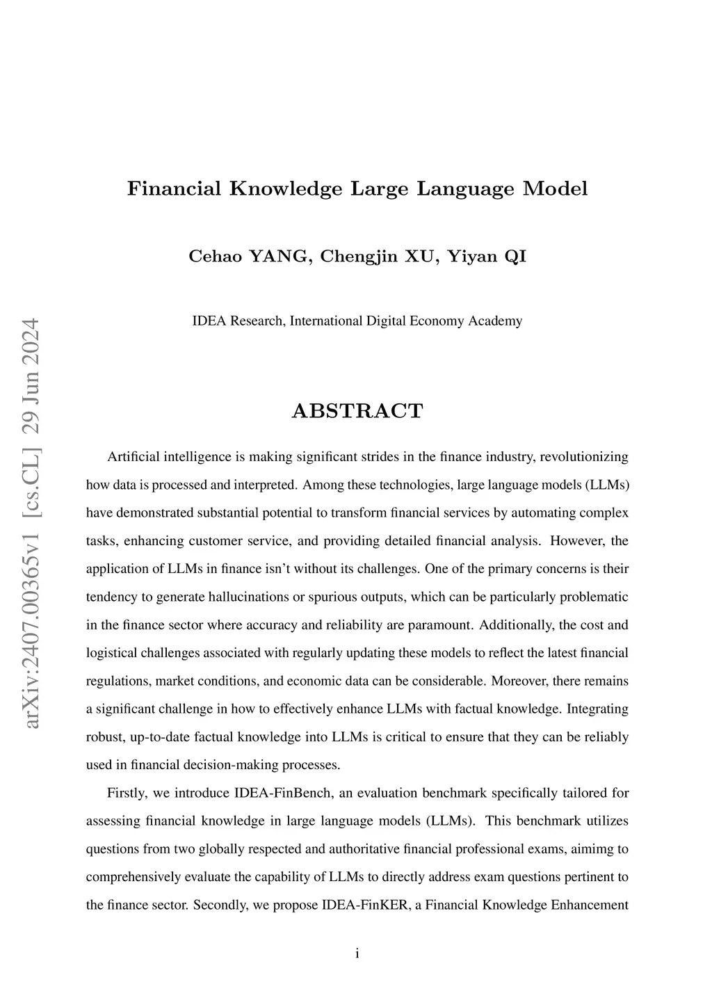 Artificial intelligence is making significant strides in the finance industry, revolutionizing how data is processed and interpreted. Among these technologies, large language models (LLMs) have demonstrated substantial potential to transform financial services by automating complex tasks, enhancing customer service, and providing detailed financial analysis. Firstly, we introduce IDEA-FinBench, an evaluation benchmark specifically tailored for assessing financial knowledge in large language models (LLMs). This benchmark utilizes questions from two globally respected and authoritative financial professional exams, aimimg to comprehensively evaluate the capability of LLMs to directly address exam questions pertinent to the finance sector. Secondly, we propose IDEA-FinKER, a Financial Knowledge Enhancement framework designed to facilitate the rapid adaptation of general LLMs to the financial domain, introducing a retrieval-based few-shot learning method for real-time context-level knowledge injection, and a set of high-quality financial knowledge instructions for fine-tuning any general LLM. Finally, we present IDEA-FinQA, a financial question-answering system powered by LLMs. This system is structured around a scheme of real-time knowledge injection and factual enhancement using external knowledge. IDEA-FinQA is comprised of three main modules: the data collector, the data querying module, and LLM-based agents tasked with specific functions.
