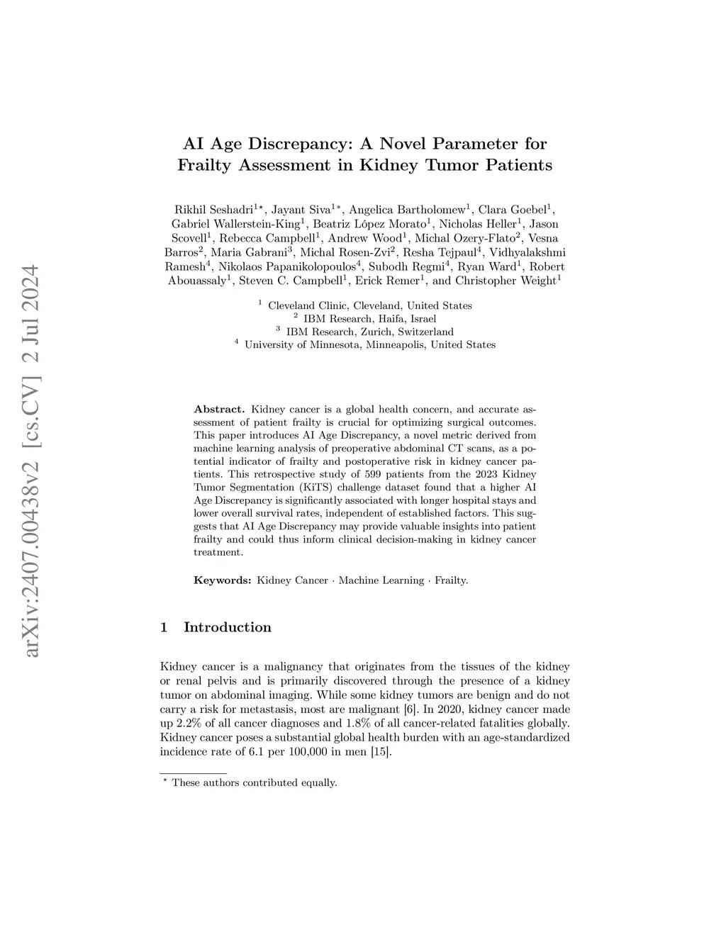 Kidney cancer is a global health concern, and accurate assessment of patient frailty is crucial for optimizing surgical outcomes. This paper introduces AI Age Discrepancy, a novel metric derived from machine learning analysis of preoperative abdominal CT scans, as a potential indicator of frailty and postoperative risk in kidney cancer patients. This retrospective study of 599 patients from the 2023 Kidney Tumor Segmentation (KiTS) challenge dataset found that a higher AI Age Discrepancy is significantly associated with longer hospital stays and lower overall survival rates, independent of established factors. This suggests that AI Age Discrepancy may provide valuable insights into patient frailty and could thus inform clinical decision-making in kidney cancer treatment.