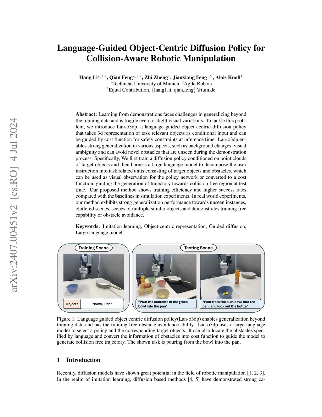Learning from demonstrations faces challenges in generalizing beyond the training data and often lacks collision awareness. This paper introduces Lan-o3dp, a language-guided object-centric diffusion policy framework that can adapt to unseen situations such as cluttered scenes, shifting camera views, and ambiguous similar objects while offering training-free collision avoidance and achieving a high success rate with few demonstrations. We train a diffusion model conditioned on 3D point clouds of task-relevant objects to predict the robot's end-effector trajectories, enabling it to complete the tasks. During inference, we incorporate cost optimization into denoising steps to guide the generated trajectory to be collision-free. We leverage open-set segmentation to obtain the 3D point clouds of related objects. We use a large language model to identify the target objects and possible obstacles by interpreting the user's natural language instructions. To effectively guide the conditional diffusion model using a time-independent cost function, we proposed a novel guided generation mechanism based on the estimated clean trajectories. In the simulation, we showed that diffusion policy based on the object-centric 3D representation achieves a much higher success rate (68.7%) compared to baselines with simple 2D (39.3%) and 3D scene (43.6%) representations across 21 challenging RLBench tasks with only 40 demonstrations. In real-world experiments, we extensively evaluated the generalization in various unseen situations and validated the effectiveness of the proposed zero-shot cost-guided collision avoidance.
