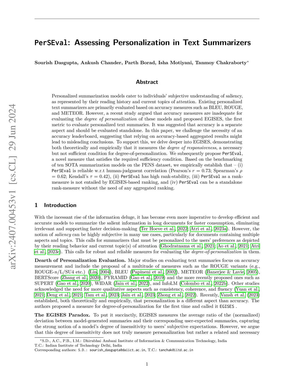 Personalized summarization models cater to individuals' subjective understanding of saliency, as represented by their reading history and current topics of attention. Existing personalized text summarizers are primarily evaluated based on accuracy measures such as BLEU, ROUGE, and METEOR. However, a recent study argued that accuracy measures are inadequate for evaluating the degree of personalization of these models and proposed EGISES, the first metric to evaluate personalized text summaries. It was suggested that accuracy is a separate aspect and should be evaluated standalone. In this paper, we challenge the necessity of an accuracy leaderboard, suggesting that relying on accuracy-based aggregated results might lead to misleading conclusions. To support this, we delve deeper into EGISES, demonstrating both theoretically and empirically that it measures the degree of responsiveness, a necessary but not sufficient condition for degree-of-personalization. We subsequently propose PerSEval, a novel measure that satisfies the required sufficiency condition. Based on the benchmarking of ten SOTA summarization models on the PENS dataset, we empirically establish that -- (i) PerSEval is reliable w.r.t human-judgment correlation (Pearson's r = 0.73; Spearman's = 0.62; Kendall's = 0.42), (ii) PerSEval has high rank-stability, (iii) PerSEval as a rank-measure is not entailed by EGISES-based ranking, and (iv) PerSEval can be a standalone rank-measure without the need of any aggregated ranking.