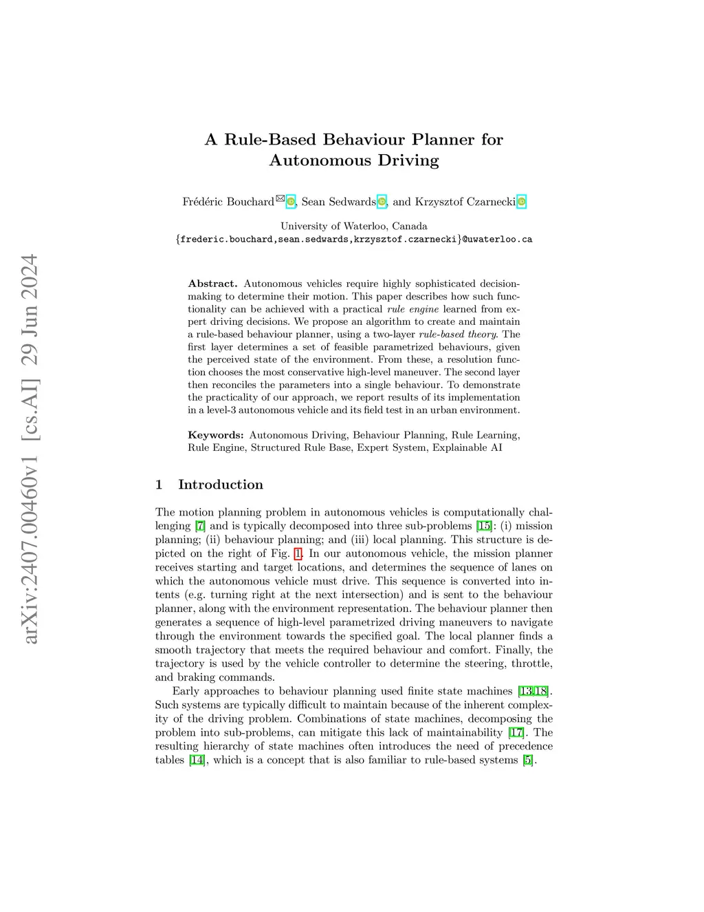 A Rule-Based Behaviour Planner for Autonomous Driving