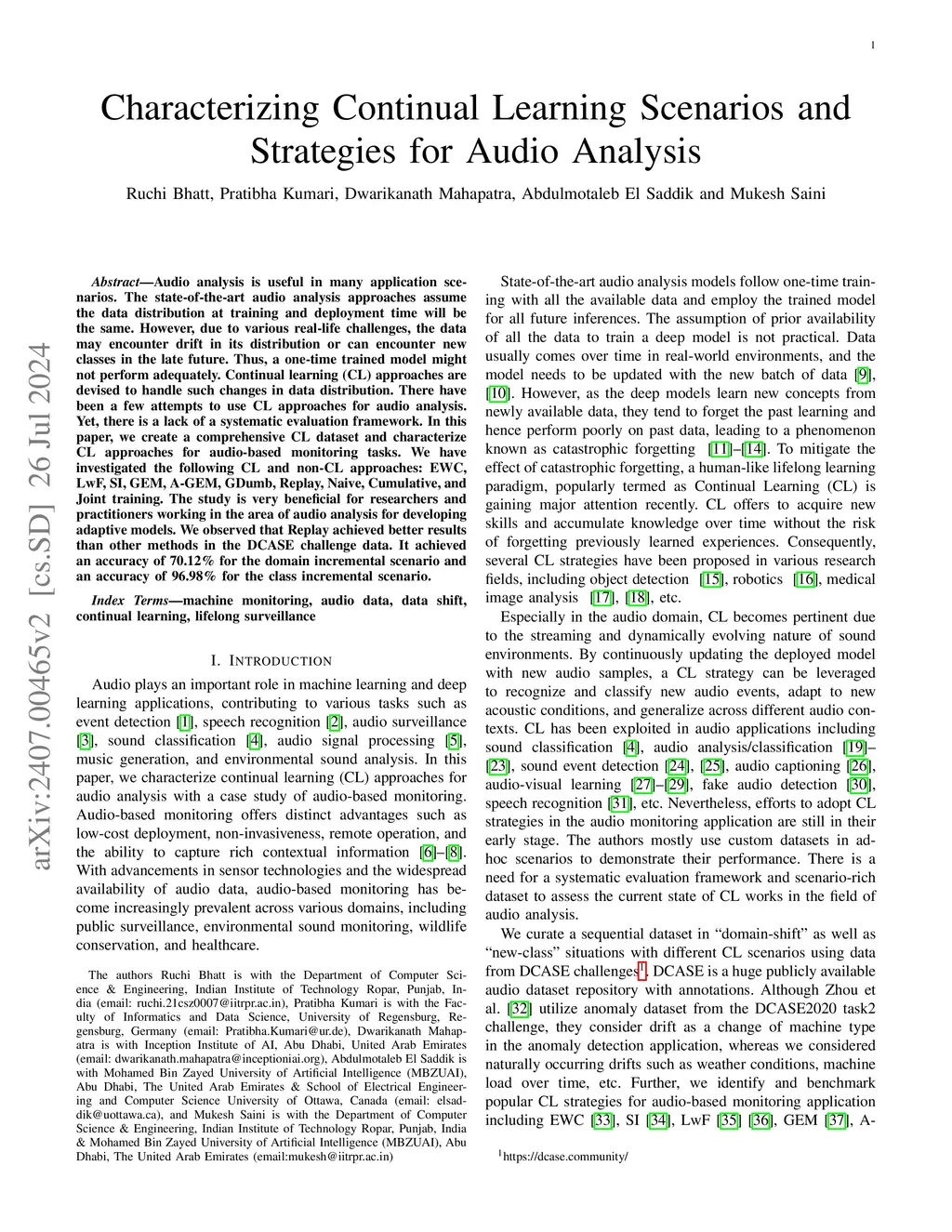 Audio analysis is useful in many application scenarios. The state-of-the-art audio analysis approaches assume the data distribution at training and deployment time will be the same. However, due to various real-life challenges, the data may encounter drift in its distribution or can encounter new classes in the late future. Thus, a one-time trained model might not perform adequately. Continual learning (CL) approaches are devised to handle such changes in data distribution. There have been a few attempts to use CL approaches for audio analysis. Yet, there is a lack of a systematic evaluation framework. In this paper, we create a comprehensive CL dataset and characterize CL approaches for audio-based monitoring tasks. We have investigated the following CL and non-CL approaches: EWC, LwF, SI, GEM, A-GEM, GDumb, Replay, Naive, Cumulative, and Joint training. The study is very beneficial for researchers and practitioners working in the area of audio analysis for developing adaptive models. We observed that Replay achieved better results than other methods in the DCASE challenge data. It achieved an accuracy of 70.12% for the domain incremental scenario and an accuracy of 96.98% for the class incremental scenario.