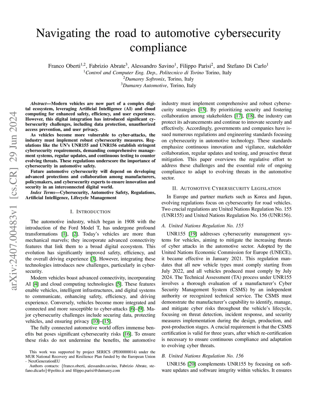 The automotive industry has evolved significantly since the introduction of the Ford Model T in 1908. Today's vehicles are not merely mechanical constructs; they are integral components of a complex digital ecosystem, equipped with advanced connectivity features powered by Artificial Intelligence and cloud computing technologies. This evolution has enhanced vehicle safety, efficiency, and the overall driving experience. However, it also introduces new challenges, notably in cybersecurity. With the increasing integration of digital technologies, vehicles have become more susceptible to cyber-attacks, prompting significant cybersecurity concerns. These concerns include securing sensitive data, protecting vehicles from unauthorized access, and ensuring user privacy. In response, the automotive industry is compelled to adopt robust cybersecurity measures to safeguard both vehicles and data against potential threats. Legislative frameworks such as UNR155 and UNR156 by the United Nations, along with other international regulations, aim to establish stringent cybersecurity mandates. These regulations require compliance with comprehensive cybersecurity management systems and necessitate regular updates and testing to cope with the evolving nature of cyber threats. The introduction of such regulations highlights the growing recognition of cybersecurity as a critical component of automotive safety and functionality. The future of automotive cybersecurity lies in the continuous development of advanced protective measures and collaborative efforts among all stakeholders, including manufacturers, policymakers, and cybersecurity professionals. Only through such concerted efforts can the industry hope to address the dual goals of innovation in vehicle functionality and stringent security measures against the backdrop of an increasingly interconnected digital landscape.