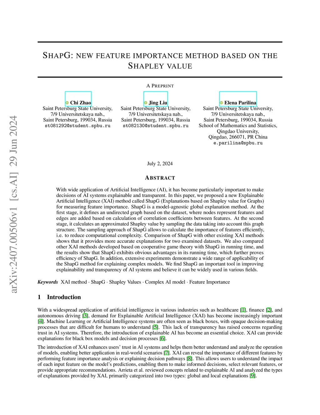 With wide application of Artificial Intelligence (AI), it has become particularly important to make decisions of AI systems explainable and transparent. In this paper, we proposed a new Explainable Artificial Intelligence (XAI) method called ShapG (Explanations based on Shapley value for Graphs) for measuring feature importance. ShapG is a model-agnostic global explanation method. At the first stage, it defines an undirected graph based on the dataset, where nodes represent features and edges are added based on calculation of correlation coefficients between features. At the second stage, it calculates an approximated Shapley value by sampling the data taking into account this graph structure. The sampling approach of ShapG allows to calculate the importance of features efficiently, i.e. to reduce computational complexity. Comparison of ShapG with other existing XAI methods shows that it provides more accurate explanations for two examined datasets. We also compared other XAI methods developed based on cooperative game theory with ShapG in running time, and the results show that ShapG exhibits obvious advantages in its running time, which further proves efficiency of ShapG. In addition, extensive experiments demonstrate a wide range of applicability of the ShapG method for explaining complex models. We find ShapG an important tool in improving explainability and transparency of AI systems and believe it can be widely used in various fields.