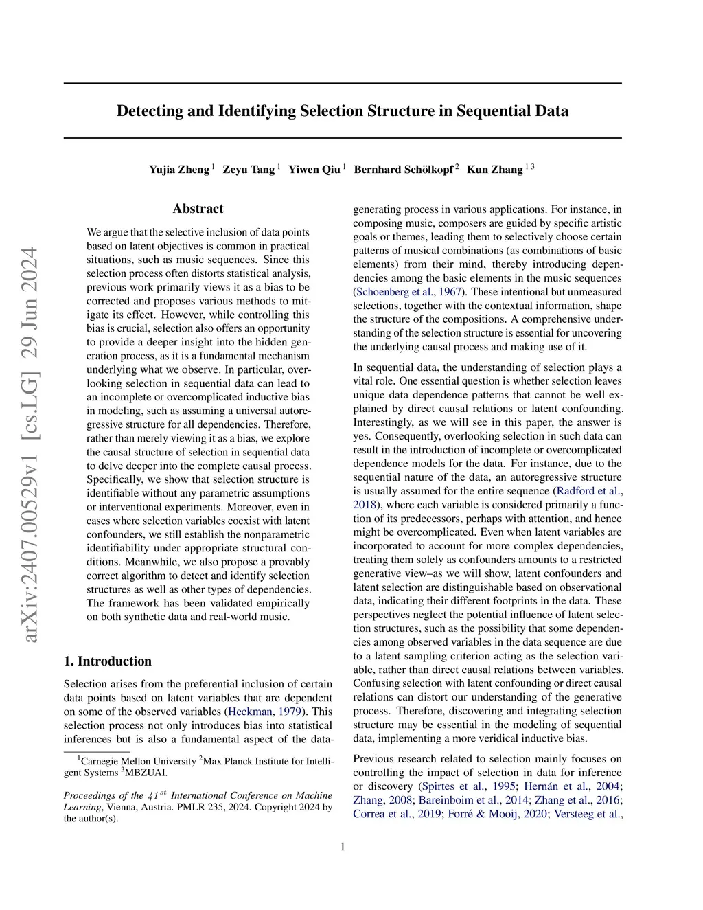 We argue that the selective inclusion of data points based on latent objectives is common in practical situations, such as music sequences. Since this selection process often distorts statistical analysis, previous work primarily views it as a bias to be corrected and proposes various methods to mitigate its effect. However, while controlling this bias is crucial, selection also offers an opportunity to provide a deeper insight into the hidden generation process, as it is a fundamental mechanism underlying what we observe. In particular, overlooking selection in sequential data can lead to an incomplete or overcomplicated inductive bias in modeling, such as assuming a universal autoregressive structure for all dependencies. Therefore, rather than merely viewing it as a bias, we explore the causal structure of selection in sequential data to delve deeper into the complete causal process. Specifically, we show that selection structure is identifiable without any parametric assumptions or interventional experiments. Moreover, even in cases where selection variables coexist with latent confounders, we still establish the nonparametric identifiability under appropriate structural conditions. Meanwhile, we also propose a provably correct algorithm to detect and identify selection structures as well as other types of dependencies. The framework has been validated empirically on both synthetic data and real-world music.