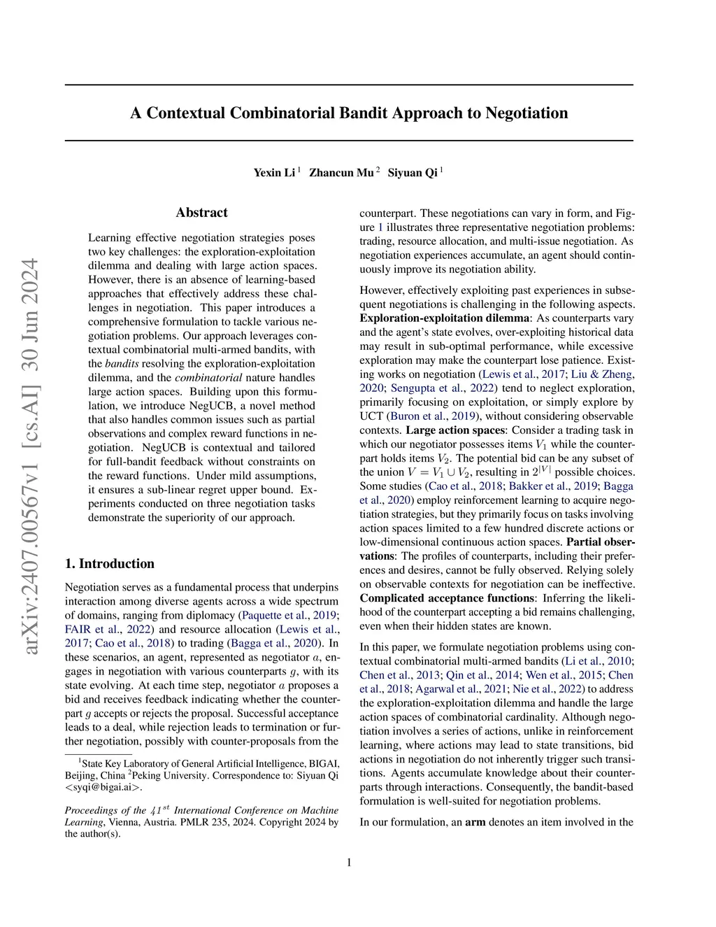 Learning effective negotiation strategies poses two key challenges: the exploration-exploitation dilemma and dealing with large action spaces. However, there is an absence of learning-based approaches that effectively address these challenges in negotiation. This paper introduces a comprehensive formulation to tackle various negotiation problems. Our approach leverages contextual combinatorial multi-armed bandits, with the bandits resolving the exploration-exploitation dilemma, and the combinatorial nature handles large action spaces. Building upon this formulation, we introduce NegUCB, a novel method that also handles common issues such as partial observations and complex reward functions in negotiation. NegUCB is contextual and tailored for full-bandit feedback without constraints on the reward functions. Under mild assumptions, it ensures a sub-linear regret upper bound. Experiments conducted on three negotiation tasks demonstrate the superiority of our approach.