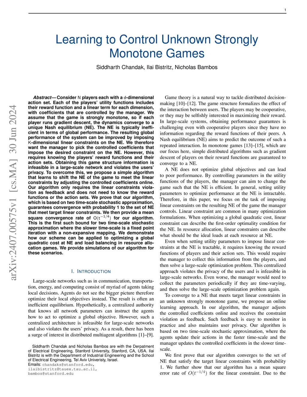 Learning to Control Unknown Strongly Monotone Games