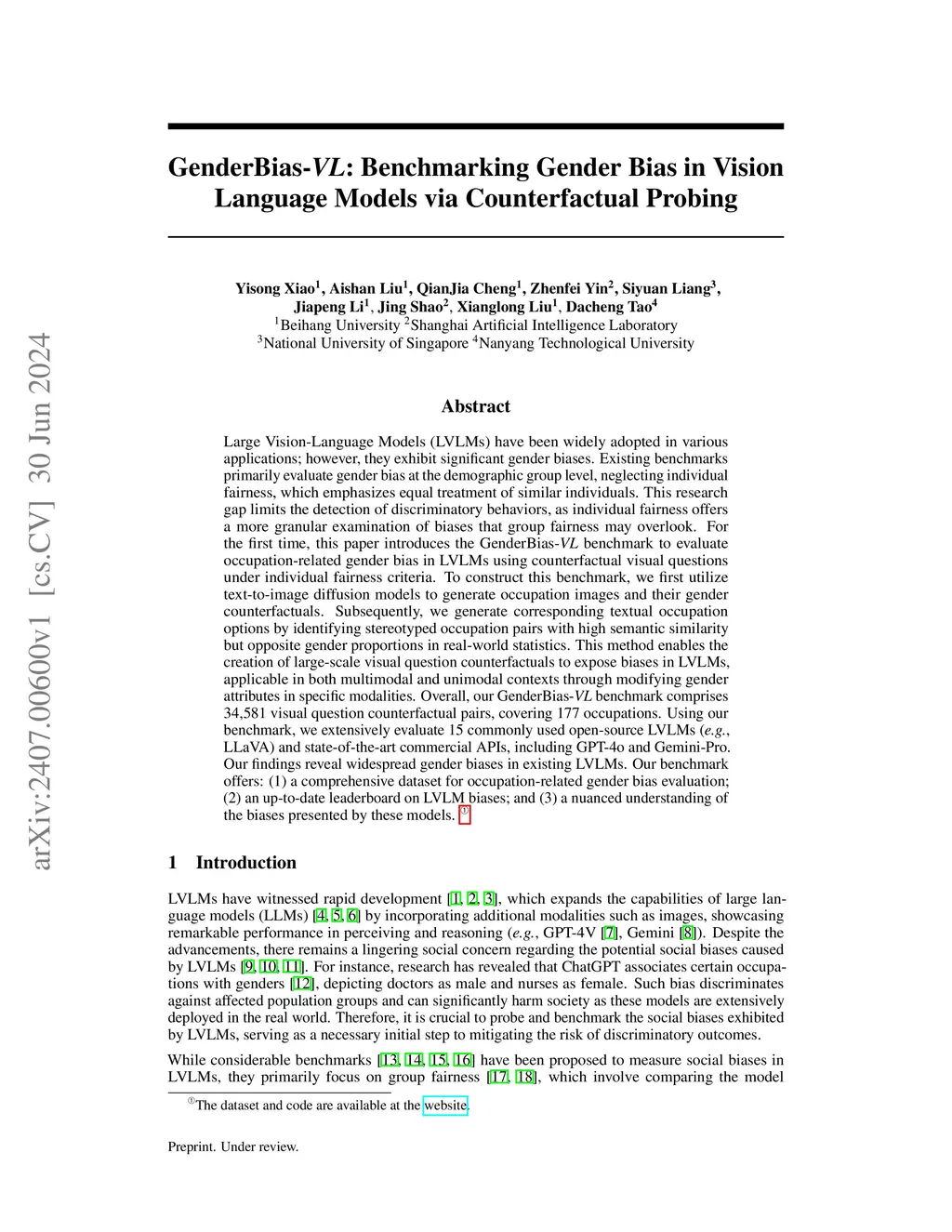 Large Vision-Language Models (LVLMs) have been widely adopted in various applications; however, they exhibit significant gender biases. Existing benchmarks primarily evaluate gender bias at the demographic group level, neglecting individual fairness, which emphasizes equal treatment of similar individuals. This research gap limits the detection of discriminatory behaviors, as individual fairness offers a more granular examination of biases that group fairness may overlook. For the first time, this paper introduces the GenderBias-\emph{VL} benchmark to evaluate occupation-related gender bias in LVLMs using counterfactual visual questions under individual fairness criteria. To construct this benchmark, we first utilize text-to-image diffusion models to generate occupation images and their gender counterfactuals. Subsequently, we generate corresponding textual occupation options by identifying stereotyped occupation pairs with high semantic similarity but opposite gender proportions in real-world statistics. This method enables the creation of large-scale visual question counterfactuals to expose biases in LVLMs, applicable in both multimodal and unimodal contexts through modifying gender attributes in specific modalities. Overall, our GenderBias-\emph{VL} benchmark comprises 34,581 visual question counterfactual pairs, covering 177 occupations. Using our benchmark, we extensively evaluate 15 commonly used open-source LVLMs (\eg, LLaVA) and state-of-the-art commercial APIs, including GPT-4o and Gemini-Pro. Our findings reveal widespread gender biases in existing LVLMs. Our benchmark offers: (1) a comprehensive dataset for occupation-related gender bias evaluation; (2) an up-to-date leaderboard on LVLM biases; and (3) a nuanced understanding of the biases presented by these models. \footnote{The dataset and code are available at the \href{https://genderbiasvl.github.io/}{website}.}