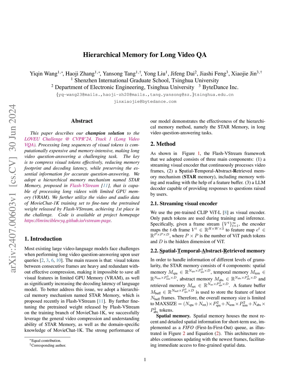 This paper describes our champion solution to the LOVEU Challenge @ CVPR'24, Track 1 (Long Video VQA). Processing long sequences of visual tokens is computationally expensive and memory-intensive, making long video question-answering a challenging task. The key is to compress visual tokens effectively, reducing memory footprint and decoding latency, while preserving the essential information for accurate question-answering. We adopt a hierarchical memory mechanism named STAR Memory, proposed in Flash-VStream, that is capable of processing long videos with limited GPU memory (VRAM). We further utilize the video and audio data of MovieChat-1K training set to fine-tune the pretrained weight released by Flash-VStream, achieving 1st place in the challenge. Code is available at project homepage https://invinciblewyq.github.io/vstream-page