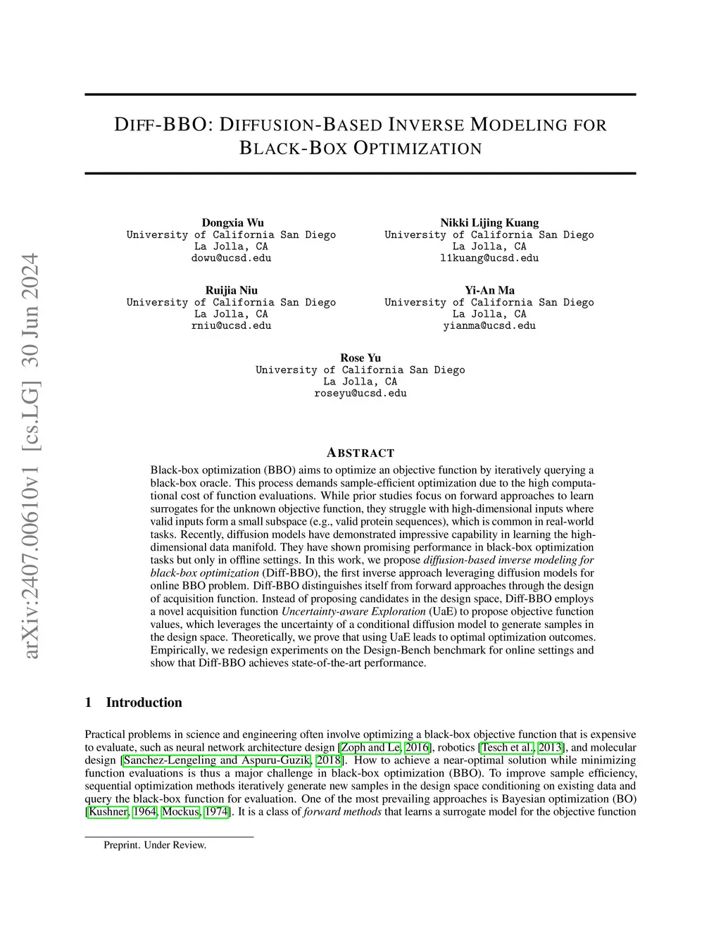 Online black-box optimization (BBO) aims to optimize an objective function by iteratively querying a black-box oracle in a sample-efficient way. While prior studies focus on forward approaches such as Gaussian Processes (GPs) to learn a surrogate model for the unknown objective function, they struggle with steering clear of out-of-distribution and invalid designs in scientific discovery tasks. Recently, inverse modeling approaches that map the objective space to the design space with conditional diffusion models have demonstrated impressive capability in learning the data manifold. However, these approaches proceed in an offline fashion with pre-collected data. How to design inverse approaches for online BBO to actively query new data and improve the sample efficiency remains an open question. In this work, we propose Diffusion-BBO, a sample-efficient online BBO framework leveraging the conditional diffusion model as the inverse surrogate model. Diffusion-BBO employs a novel acquisition function Uncertainty-aware Exploration (UaE) to propose scores in the objective space for conditional sampling. We theoretically prove that Diffusion-BBO with UaE achieves a near-optimal solution for online BBO. We also empirically demonstrate that Diffusion-BBO with UaE outperforms existing online BBO baselines across 6 scientific discovery tasks.