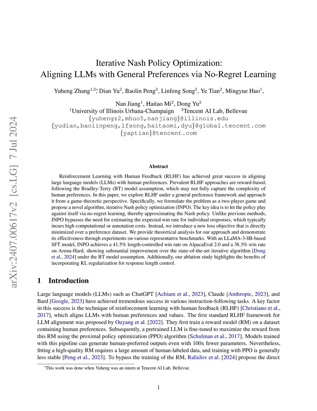 Iterative Nash Policy Optimization: Aligning LLMs with General Preferences via No-Regret Learning