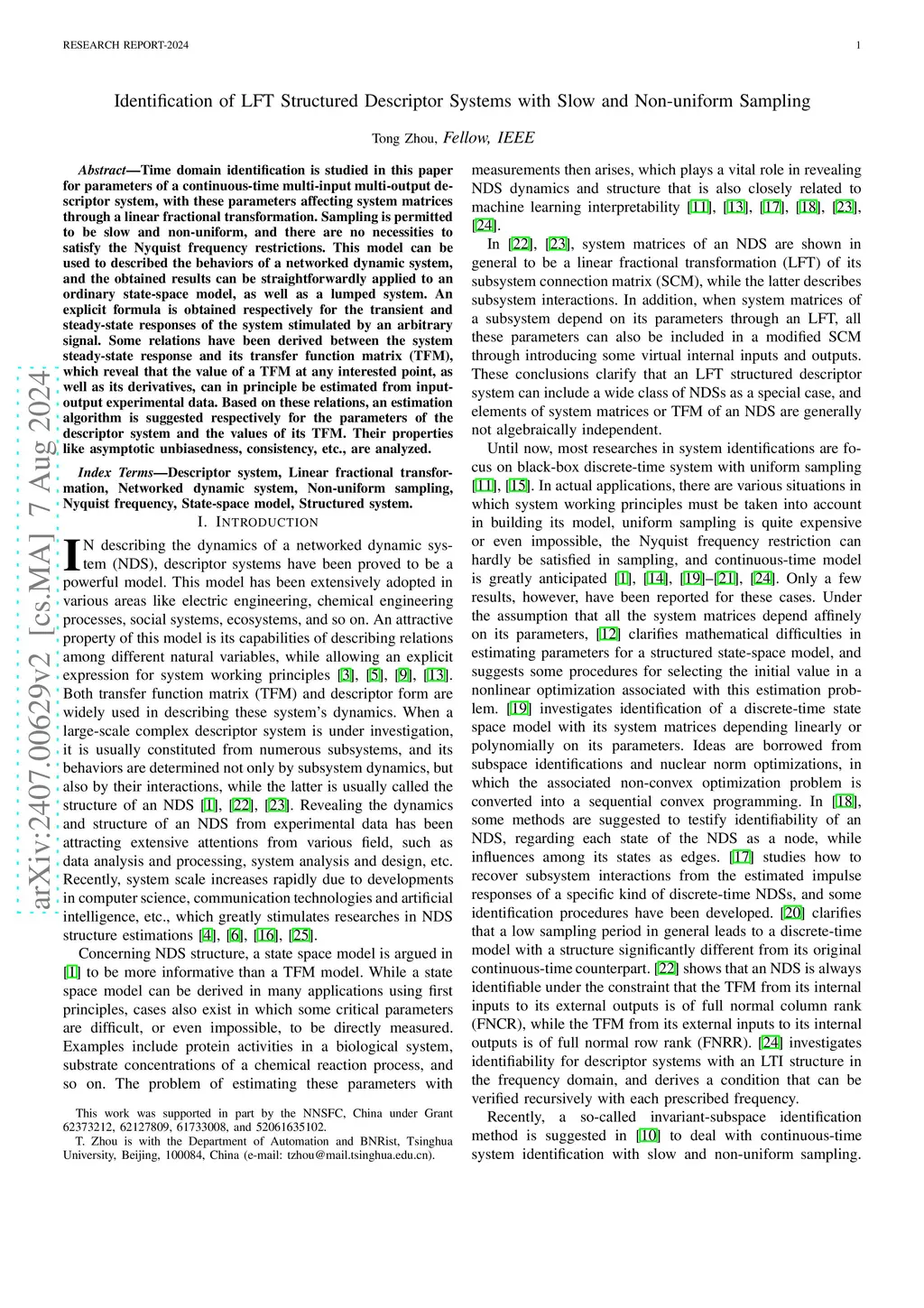 Time domain identification is studied in this paper for parameters of a continuous-time multi-input multi-output descriptor system, with these parameters affecting system matrices through a linear fractional transformation. Sampling is permitted to be slow and non-uniform, and there are no necessities to satisfy the Nyquist frequency restrictions. This model can be used to described the behaviors of a networked dynamic system, and the obtained results can be straightforwardly applied to an ordinary state-space model, as well as a lumped system. An explicit formula is obtained respectively for the transient and steady-state responses of the system stimulated by an arbitrary signal. Some relations have been derived between the system steady-state response and its transfer function matrix (TFM), which reveal that the value of a TFM at almost any interested point, as well as its derivatives and a right tangential interpolation along an arbitrary direction, can in principle be estimated from input-output experimental data. Based on these relations, an estimation algorithm is suggested respectively for the parameters of the descriptor system and the values of its TFM. Their properties like asymptotic unbiasedness, consistency, etc., are analyzed.