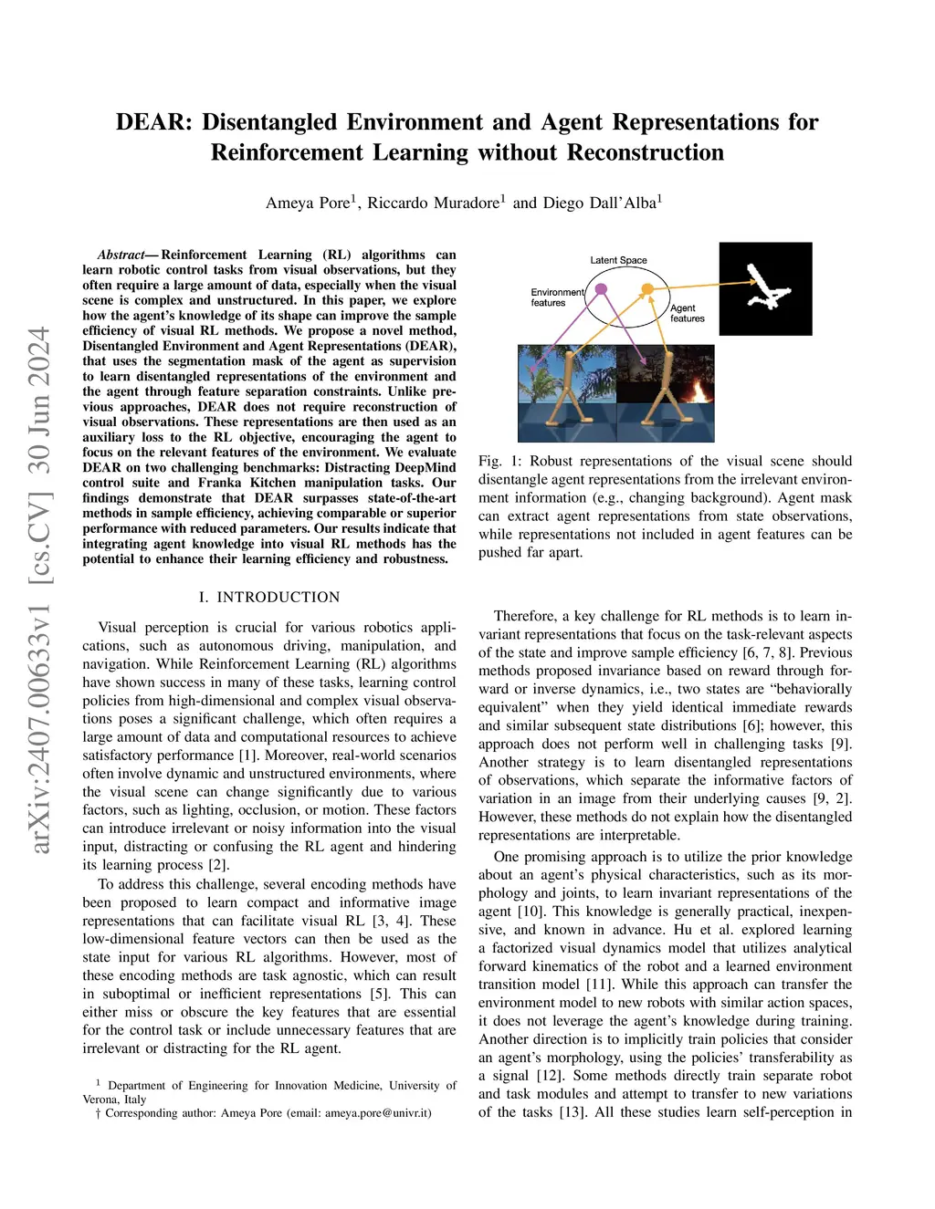 Reinforcement Learning (RL) algorithms can learn robotic control tasks from visual observations, but they often require a large amount of data, especially when the visual scene is complex and unstructured. In this paper, we explore how the agent's knowledge of its shape can improve the sample efficiency of visual RL methods. We propose a novel method, Disentangled Environment and Agent Representations (DEAR), that uses the segmentation mask of the agent as supervision to learn disentangled representations of the environment and the agent through feature separation constraints. Unlike previous approaches, DEAR does not require reconstruction of visual observations. These representations are then used as an auxiliary loss to the RL objective, encouraging the agent to focus on the relevant features of the environment. We evaluate DEAR on two challenging benchmarks: Distracting DeepMind control suite and Franka Kitchen manipulation tasks. Our findings demonstrate that DEAR surpasses state-of-the-art methods in sample efficiency, achieving comparable or superior performance with reduced parameters. Our results indicate that integrating agent knowledge into visual RL methods has the potential to enhance their learning efficiency and robustness.