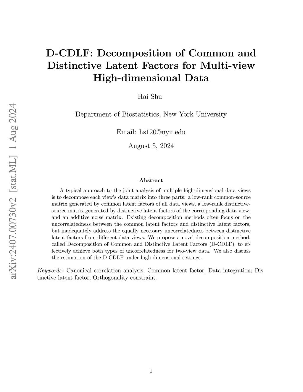 A typical approach to the joint analysis of multiple high-dimensional data views is to decompose each view's data matrix into three parts: a low-rank common-source matrix generated by common latent factors of all data views, a low-rank distinctive-source matrix generated by distinctive latent factors of the corresponding data view, and an additive noise matrix. Existing decomposition methods often focus on the uncorrelatedness between the common latent factors and distinctive latent factors, but inadequately address the equally necessary uncorrelatedness between distinctive latent factors from different data views. We propose a novel decomposition method, called Decomposition of Common and Distinctive Latent Factors (D-CDLF), to effectively achieve both types of uncorrelatedness for two-view data. We also discuss the estimation of the D-CDLF under high-dimensional settings.