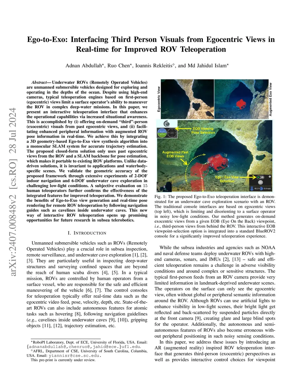 Underwater ROVs (Remotely Operated Vehicles) are indispensable for subsea exploration and task execution, yet typical teleoperation engines based on egocentric (first-person) video feeds restrict human operators' field-of-view and limit precise maneuvering in complex, unstructured underwater environments. To address this, we propose EgoExo, a geometry-driven solution integrated into a visual SLAM pipeline that synthesizes on-demand exocentric (third-person) views from egocentric camera feeds. Our proposed framework, EgoExo++, extends beyond 2D exocentric view synthesis (EgoExo) to augment a dense 2.5D ground surface estimation on-the-fly. It simultaneously renders the ROV model onto this reconstructed surface, enhancing semantic perception and depth comprehension. The computations involved are closed-form and rely solely on egocentric views and monocular SLAM estimates, which makes it portable across existing teleoperation engines and robust to varying waterbody characteristics. We validate the geometric accuracy of our approach through extensive experiments of 2-DOF indoor navigation and 6-DOF underwater cave exploration in challenging low-light conditions. Quantitative metrics confirm the reliability of the rendered Exo views, while a user study involving 15 operators demonstrates improved situational awareness, navigation safety, and task efficiency during teleoperation. Furthermore, we highlight the role of EgoExo++ augmented visuals in supporting shared autonomy, operator training, and embodied teleoperation. This new interactive approach to ROV teleoperation presents promising opportunities for future research in subsea telerobotics.