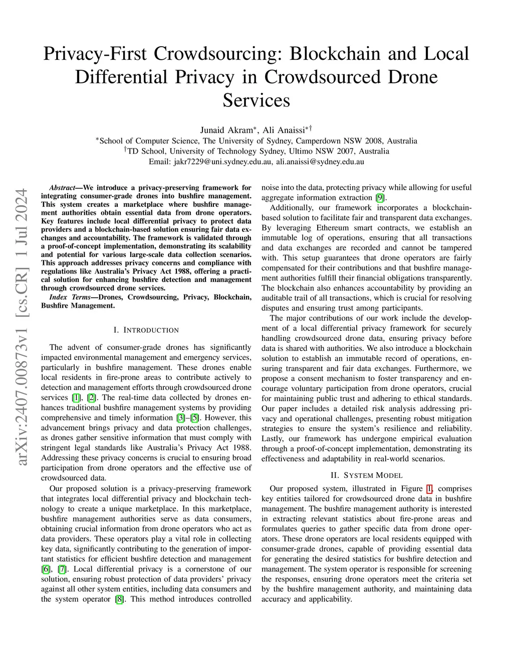 We introduce a privacy-preserving framework for integrating consumer-grade drones into bushfire management. This system creates a marketplace where bushfire management authorities obtain essential data from drone operators. Key features include local differential privacy to protect data providers and a blockchain-based solution ensuring fair data exchanges and accountability. The framework is validated through a proof-of-concept implementation, demonstrating its scalability and potential for various large-scale data collection scenarios. This approach addresses privacy concerns and compliance with regulations like Australia's Privacy Act 1988, offering a practical solution for enhancing bushfire detection and management through crowdsourced drone services.