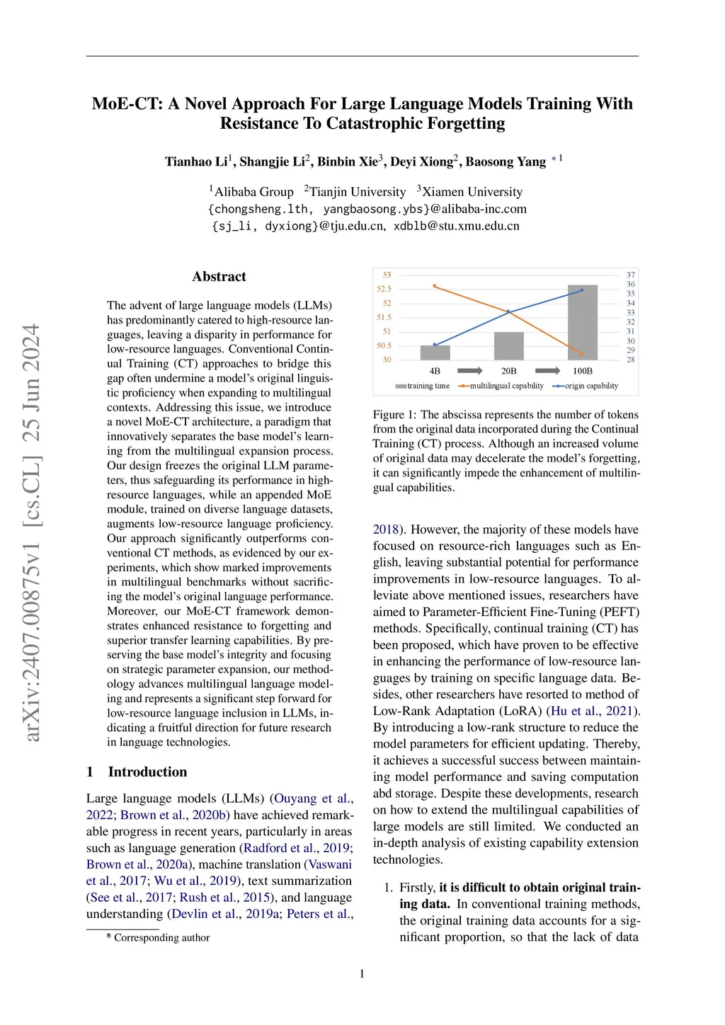 The advent of large language models (LLMs) has predominantly catered to high-resource languages, leaving a disparity in performance for low-resource languages. Conventional Continual Training (CT) approaches to bridge this gap often undermine a model's original linguistic proficiency when expanding to multilingual contexts. Addressing this issue, we introduce a novel MoE-CT architecture, a paradigm that innovatively separates the base model's learning from the multilingual expansion process. Our design freezes the original LLM parameters, thus safeguarding its performance in high-resource languages, while an appended MoE module, trained on diverse language datasets, augments low-resource language proficiency. Our approach significantly outperforms conventional CT methods, as evidenced by our experiments, which show marked improvements in multilingual benchmarks without sacrificing the model's original language performance. Moreover, our MoE-CT framework demonstrates enhanced resistance to forgetting and superior transfer learning capabilities. By preserving the base model's integrity and focusing on strategic parameter expansion, our methodology advances multilingual language modeling and represents a significant step forward for low-resource language inclusion in LLMs, indicating a fruitful direction for future research in language technologies.