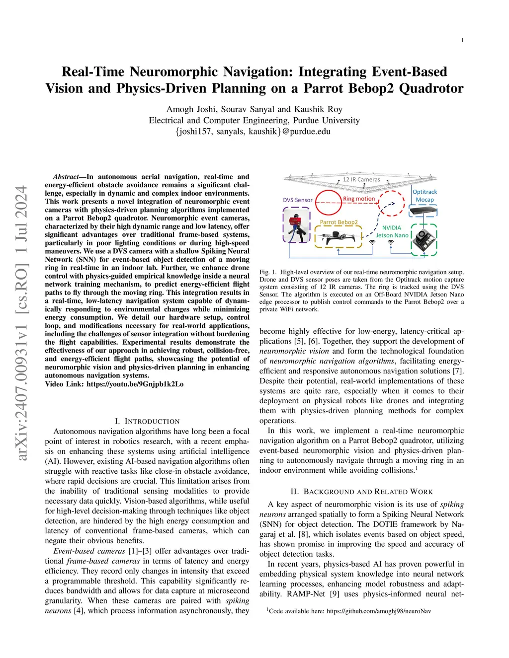 In autonomous aerial navigation, real-time and energy-efficient obstacle avoidance remains a significant challenge, especially in dynamic and complex indoor environments. This work presents a novel integration of neuromorphic event cameras with physics-driven planning algorithms implemented on a Parrot Bebop2 quadrotor. Neuromorphic event cameras, characterized by their high dynamic range and low latency, offer significant advantages over traditional frame-based systems, particularly in poor lighting conditions or during high-speed maneuvers. We use a DVS camera with a shallow Spiking Neural Network (SNN) for event-based object detection of a moving ring in real-time in an indoor lab. Further, we enhance drone control with physics-guided empirical knowledge inside a neural network training mechanism, to predict energy-efficient flight paths to fly through the moving ring. This integration results in a real-time, low-latency navigation system capable of dynamically responding to environmental changes while minimizing energy consumption. We detail our hardware setup, control loop, and modifications necessary for real-world applications, including the challenges of sensor integration without burdening the flight capabilities. Experimental results demonstrate the effectiveness of our approach in achieving robust, collision-free, and energy-efficient flight paths, showcasing the potential of neuromorphic vision and physics-driven planning in enhancing autonomous navigation systems.