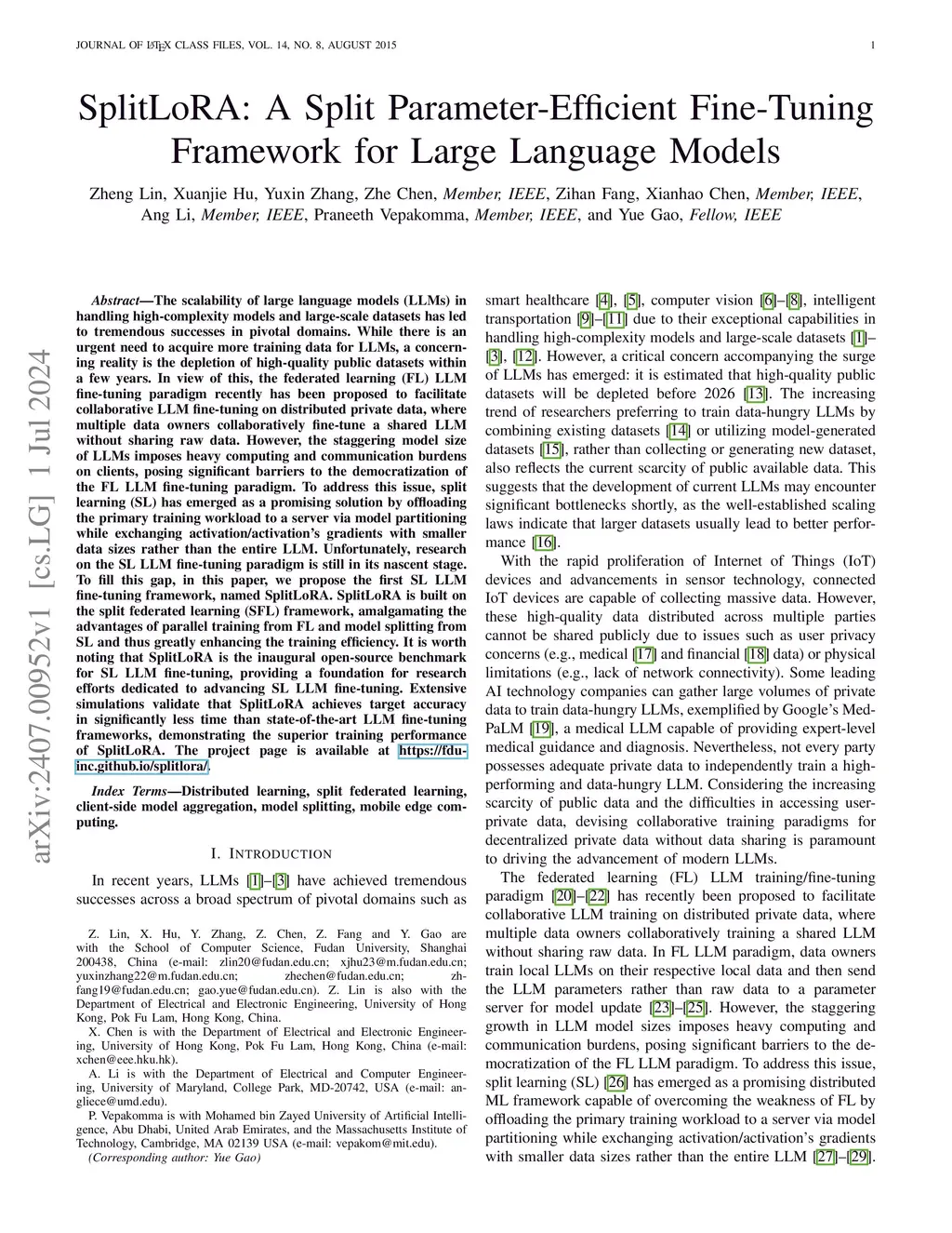SplitLoRA: A Split Parameter-Efficient Fine-Tuning Framework for Large