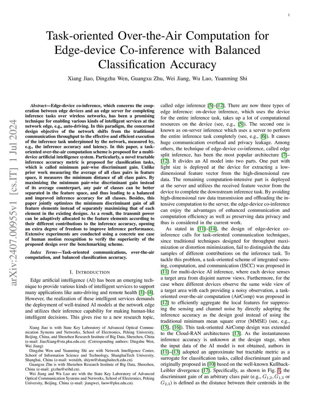Edge-device co-inference, which concerns the cooperation between edge devices and an edge server for completing inference tasks over wireless networks, has been a promising technique for enabling various kinds of intelligent services at the network edge, e.g., auto-driving. In this paradigm, the concerned design objective of the network shifts from the traditional communication throughput to the effective and efficient execution of the inference task underpinned by the network, measured by, e.g., the inference accuracy and latency. In this paper, a task-oriented over-the-air computation scheme is proposed for a multidevice artificial intelligence system. Particularly, a novel tractable inference accuracy metric is proposed for classification tasks, which is called minimum pair-wise discriminant gain. Unlike prior work measuring the average of all class pairs in feature space, it measures the minimum distance of all class pairs. By maximizing the minimum pair-wise discriminant gain instead of its average counterpart, any pair of classes can be better separated in the feature space, and thus leading to a balanced and improved inference accuracy for all classes. Besides, this paper jointly optimizes the minimum discriminant gain of all feature elements instead of separately maximizing that of each element in the existing designs. As a result, the transmit power can be adaptively allocated to the feature elements according to their different contributions to the inference accuracy, opening an extra degree of freedom to improve inference performance. Extensive experiments are conducted using a concrete use case of human motion recognition to verify the superiority of the proposed design over the benchmarking scheme.