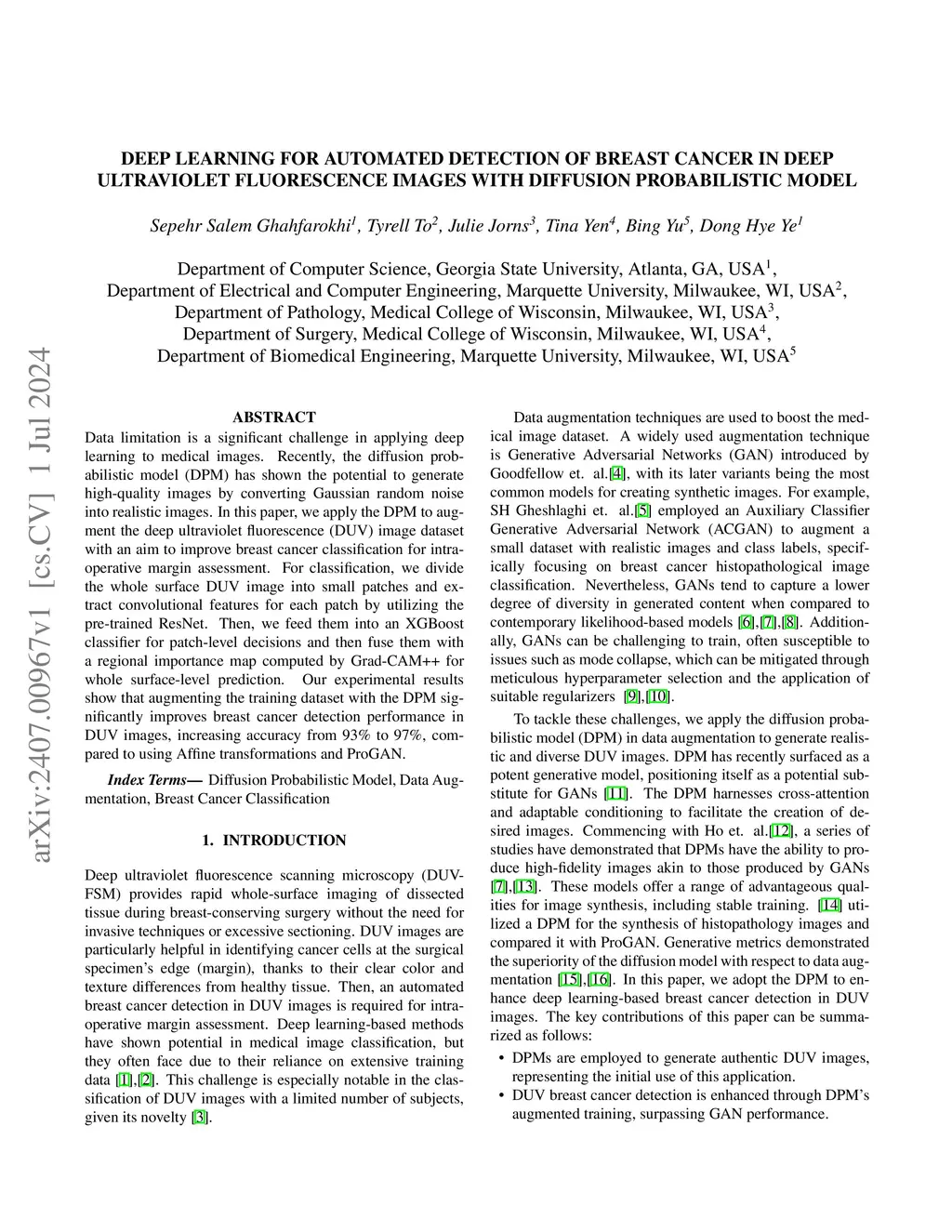 Data limitation is a significant challenge in applying deep learning to medical images. Recently, the diffusion probabilistic model (DPM) has shown the potential to generate high-quality images by converting Gaussian random noise into realistic images. In this paper, we apply the DPM to augment the deep ultraviolet fluorescence (DUV) image dataset with an aim to improve breast cancer classification for intraoperative margin assessment. For classification, we divide the whole surface DUV image into small patches and extract convolutional features for each patch by utilizing the pre-trained ResNet. Then, we feed them into an XGBoost classifier for patch-level decisions and then fuse them with a regional importance map computed by Grad-CAM++ for whole surface-level prediction. Our experimental results show that augmenting the training dataset with the DPM significantly improves breast cancer detection performance in DUV images, increasing accuracy from 93% to 97%, compared to using Affine transformations and ProGAN.