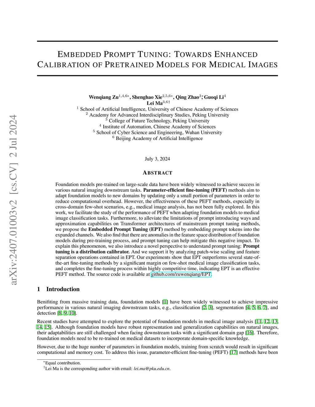 Foundation models pre-trained on large-scale data have been widely witnessed to achieve success in various natural imaging downstream tasks. Parameter-efficient fine-tuning (PEFT) methods aim to adapt foundation models to new domains by updating only a small portion of parameters in order to reduce computational overhead. However, the effectiveness of these PEFT methods, especially in cross-domain few-shot scenarios, e.g., medical image analysis, has not been fully explored. In this work, we facilitate the study of the performance of PEFT when adapting foundation models to medical image classification tasks. Furthermore, to alleviate the limitations of prompt introducing ways and approximation capabilities on Transformer architectures of mainstream prompt tuning methods, we propose the Embedded Prompt Tuning (EPT) method by embedding prompt tokens into the expanded channels. We also find that there are anomalies in the feature space distribution of foundation models during pre-training process, and prompt tuning can help mitigate this negative impact. To explain this phenomenon, we also introduce a novel perspective to understand prompt tuning: Prompt tuning is a distribution calibrator. And we support it by analyzing patch-wise scaling and feature separation operations contained in EPT. Our experiments show that EPT outperforms several state-of-the-art fine-tuning methods by a significant margin on few-shot medical image classification tasks, and completes the fine-tuning process within highly competitive time, indicating EPT is an effective PEFT method. The source code is available atthis http URL.