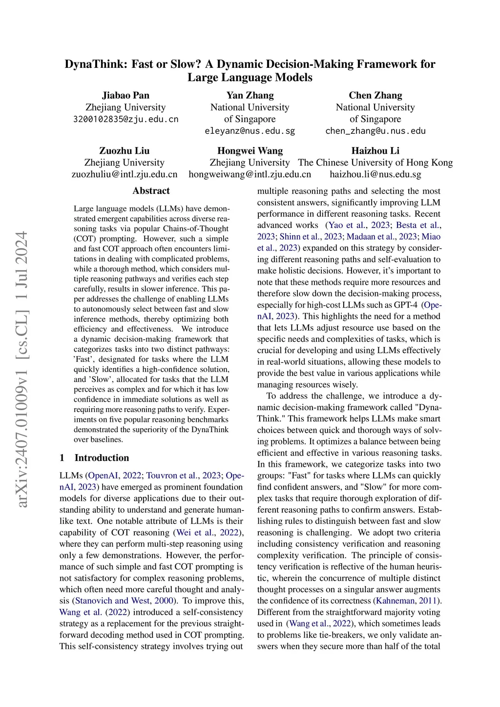 Large language models (LLMs) have demonstrated emergent capabilities across diverse reasoning tasks via popular Chains-of-Thought (COT) prompting. However, such a simple and fast COT approach often encounters limitations in dealing with complicated problems, while a thorough method, which considers multiple reasoning pathways and verifies each step carefully, results in slower inference. This paper addresses the challenge of enabling LLMs to autonomously select between fast and slow inference methods, thereby optimizing both efficiency and effectiveness. We introduce a dynamic decision-making framework that categorizes tasks into two distinct pathways: 'Fast', designated for tasks where the LLM quickly identifies a high-confidence solution, and 'Slow', allocated for tasks that the LLM perceives as complex and for which it has low confidence in immediate solutions as well as requiring more reasoning paths to verify. Experiments on five popular reasoning benchmarks demonstrated the superiority of the DynaThink over baselines.