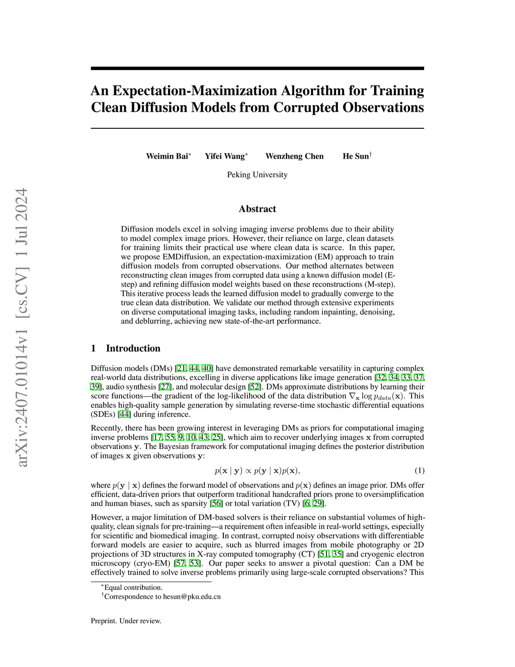 Diffusion models excel in solving imaging inverse problems due to their ability to model complex image priors. However, their reliance on large, clean datasets for training limits their practical use where clean data is scarce. In this paper, we propose EMDiffusion, an expectation-maximization (EM) approach to train diffusion models from corrupted observations. Our method alternates between reconstructing clean images from corrupted data using a known diffusion model (E-step) and refining diffusion model weights based on these reconstructions (M-step). This iterative process leads the learned diffusion model to gradually converge to the true clean data distribution. We validate our method through extensive experiments on diverse computational imaging tasks, including random inpainting, denoising, and deblurring, achieving new state-of-the-art performance.