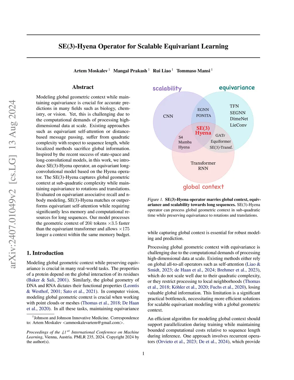 Modeling global geometric context while maintaining equivariance is crucial for accurate predictions in many fields such as biology, chemistry, or vision. Yet, this is challenging due to the computational demands of processing high-dimensional data at scale. Existing approaches such as equivariant self-attention or distance-based message passing, suffer from quadratic complexity with respect to sequence length, while localized methods sacrifice global information. Inspired by the recent success of state-space and long-convolutional models, in this work, we introduce SE(3)-Hyena operator, an equivariant long-convolutional model based on the Hyena operator. The SE(3)-Hyena captures global geometric context at sub-quadratic complexity while maintaining equivariance to rotations and translations. Evaluated on equivariant associative recall and n-body modeling, SE(3)-Hyena matches or outperforms equivariant self-attention while requiring significantly less memory and computational resources for long sequences. Our model processes the geometric context of 20k tokens x3.5 times faster than the equivariant transformer and allows x175 longer a context within the same memory budget.