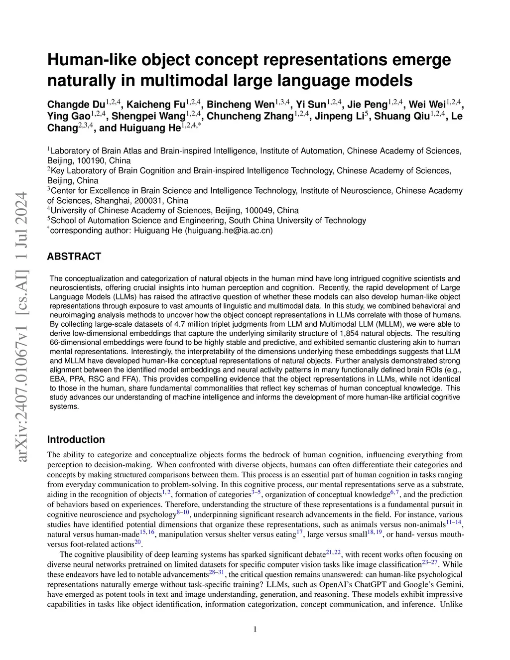 Understanding how humans conceptualize and categorize natural objects offers critical insights into perception and cognition. With the advent of Large Language Models (LLMs), a key question arises: can these models develop human-like object representations from linguistic and multimodal data? In this study, we combined behavioral and neuroimaging analyses to explore the relationship between object concept representations in LLMs and human cognition. We collected 4.7 million triplet judgments from LLMs and Multimodal LLMs (MLLMs) to derive low-dimensional embeddings that capture the similarity structure of 1,854 natural objects. The resulting 66-dimensional embeddings were stable, predictive, and exhibited semantic clustering similar to human mental representations. Remarkably, the dimensions underlying these embeddings were interpretable, suggesting that LLMs and MLLMs develop human-like conceptual representations of objects. Further analysis showed strong alignment between model embeddings and neural activity patterns in brain regions such as EBA, PPA, RSC, and FFA. This provides compelling evidence that the object representations in LLMs, while not identical to human ones, share fundamental similarities that reflect key aspects of human conceptual knowledge. Our findings advance the understanding of machine intelligence and inform the development of more human-like artificial cognitive systems.