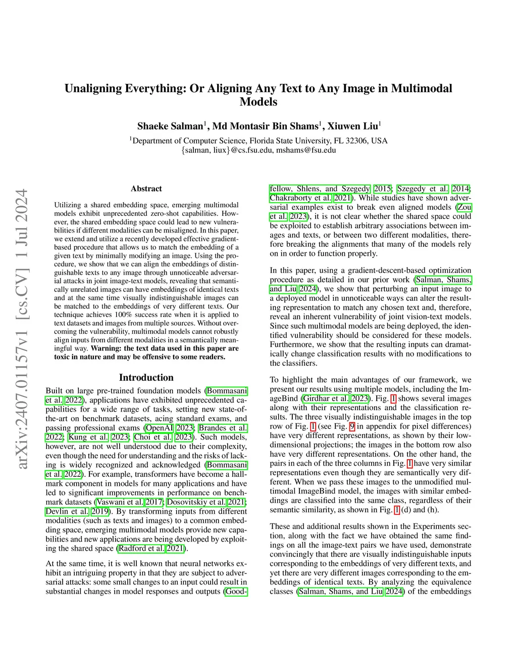 Utilizing a shared embedding space, emerging multimodal models exhibit unprecedented zero-shot capabilities. However, the shared embedding space could lead to new vulnerabilities if different modalities can be misaligned. In this paper, we extend and utilize a recently developed effective gradient-based procedure that allows us to match the embedding of a given text by minimally modifying an image. Using the procedure, we show that we can align the embeddings of distinguishable texts to any image through unnoticeable adversarial attacks in joint image-text models, revealing that semantically unrelated images can have embeddings of identical texts and at the same time visually indistinguishable images can be matched to the embeddings of very different texts. Our technique achieves 100\% success rate when it is applied to text datasets and images from multiple sources. Without overcoming the vulnerability, multimodal models cannot robustly align inputs from different modalities in a semantically meaningful way. \textbf{Warning: the text data used in this paper are toxic in nature and may be offensive to some readers.}