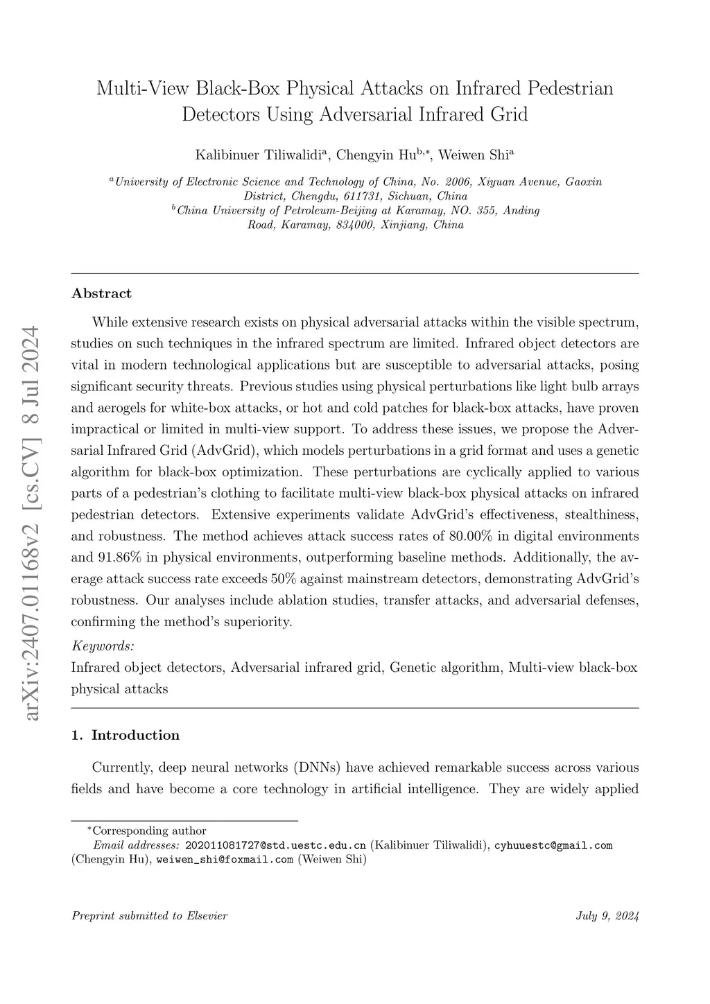While extensive research exists on physical adversarial attacks within the visible spectrum, studies on such techniques in the infrared spectrum are limited. Infrared object detectors are vital in modern technological applications but are susceptible to adversarial attacks, posing significant security threats. Previous studies using physical perturbations like light bulb arrays and aerogels for white-box attacks, or hot and cold patches for black-box attacks, have proven impractical or limited in multi-view support. To address these issues, we propose the Adversarial Infrared Grid (AdvGrid), which models perturbations in a grid format and uses a genetic algorithm for black-box optimization. These perturbations are cyclically applied to various parts of a pedestrian's clothing to facilitate multi-view black-box physical attacks on infrared pedestrian detectors. Extensive experiments validate AdvGrid's effectiveness, stealthiness, and robustness. The method achieves attack success rates of 80.00\% in digital environments and 91.86\% in physical environments, outperforming baseline methods. Additionally, the average attack success rate exceeds 50\% against mainstream detectors, demonstrating AdvGrid's robustness. Our analyses include ablation studies, transfer attacks, and adversarial defenses, confirming the method's superiority.