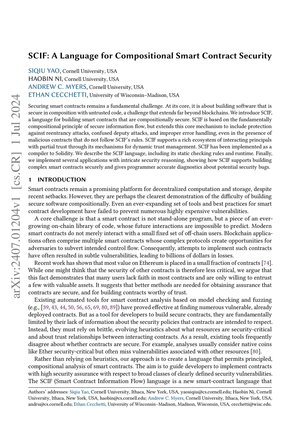 Smart contracts are frequently vulnerable to control-flow attacks based on confused deputies, reentrancy, and incorrect error handling. These attacks exploit the complexity of interactions among multiple possibly unknown contracts. Existing best practices to prevent vulnerabilities rely on code patterns and heuristics that produce both false positives and false negatives. Even with extensive audits and heuristic tools, new vulnerabilities continue to arise, routinely costing tens of millions of dollars.We introduce SCIF, a language for secure smart contracts, that addresses these classes of control-flow attacks. By extending secure information flow mechanisms in a principled way, SCIF enforces both classic end-to-end information flow security and new security restrictions on control flow, even when SCIF contracts interact with malicious non-SCIF code. SCIF is implemented as a compiler to Solidity. We show how SCIF can secure contracts with minimal overhead through case studies of applications with intricate security reasoning and a large corpus of insecure code.