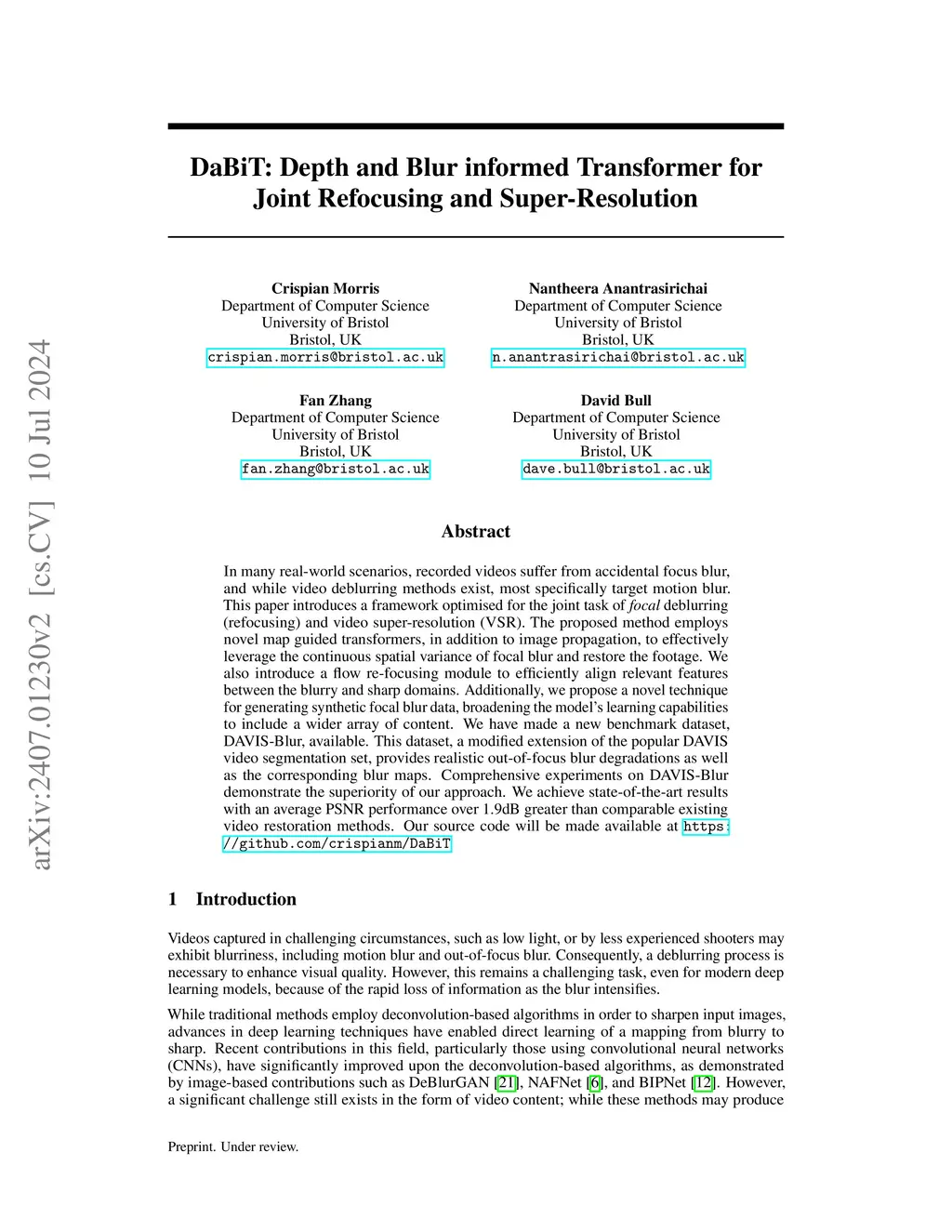 DaBiT: Depth and Blur informed Transformer for Video Focal Deblurring