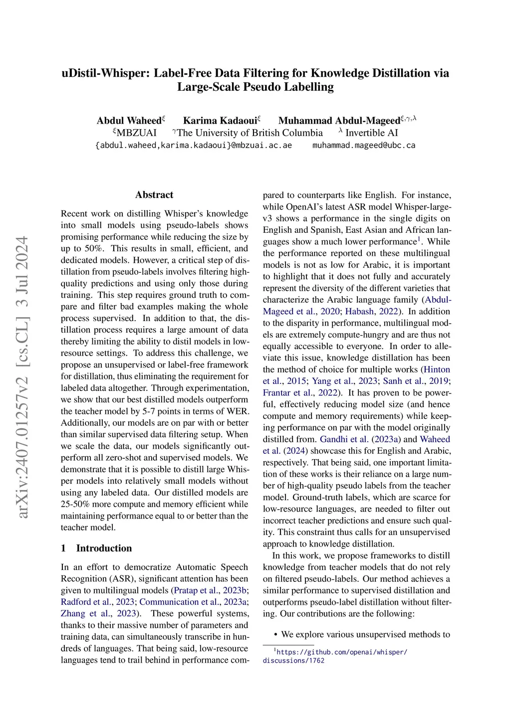 Recent work on distilling Whisper's knowledge into small models using pseudo-labels shows promising performance while reducing the size by up to 50%. This results in small, efficient, and dedicated models. However, a critical step of distillation using pseudo-labels involves filtering high-quality predictions and using only those during training. This step requires ground truth labels to compare with and filter low-quality examples, making the process dependent on human labels. Additionally, the distillation process requires a large amount of data thereby limiting its applicability in low-resource settings. To address this, we propose a distillation framework that does not require any labeled data. Through experimentation, we show that our best-distilled models outperform the teacher model by 5-7 WER points and are on par with or outperform similar supervised data filtering setups. When scaling the data, our models significantly outperform all zero-shot and supervised models. Our models are also 25-50% more compute- and memory-efficient while maintaining performance equal to or better than that of the teacher model. For more details about our models, dataset, and other resources, please visit our GitHub page:this https URL.