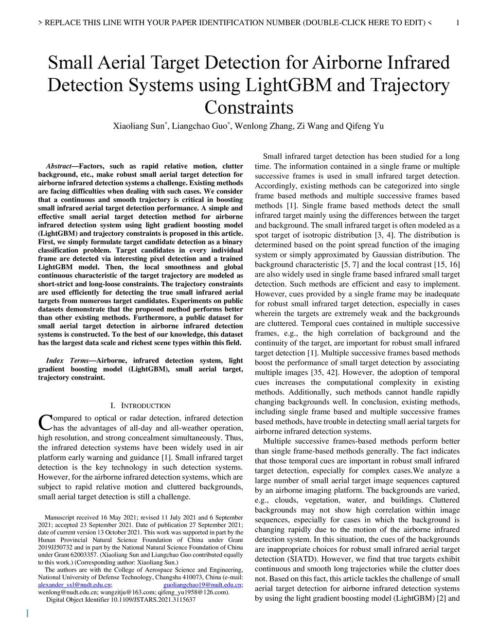 Factors, such as rapid relative motion, clutter background, etc., make robust small aerial target detection for airborne infrared detection systems a challenge. Existing methods are facing difficulties when dealing with such cases. We consider that a continuous and smooth trajectory is critical in boosting small infrared aerial target detection performance. A simple and effective small aerial target detection method for airborne infrared detection system using light gradient boosting model (LightGBM) and trajectory constraints is proposed in this article. First, we simply formulate target candidate detection as a binary classification problem. Target candidates in every individual frame are detected via interesting pixel detection and a trained LightGBM model. Then, the local smoothness and global continuous characteristic of the target trajectory are modeled as short-strict and long-loose constraints. The trajectory constraints are used efficiently for detecting the true small infrared aerial targets from numerous target candidates. Experiments on public datasets demonstrate that the proposed method performs better than other existing methods. Furthermore, a public dataset for small aerial target detection in airborne infrared detection systems is constructed. To the best of our knowledge, this dataset has the largest data scale and richest scene types within this field.
