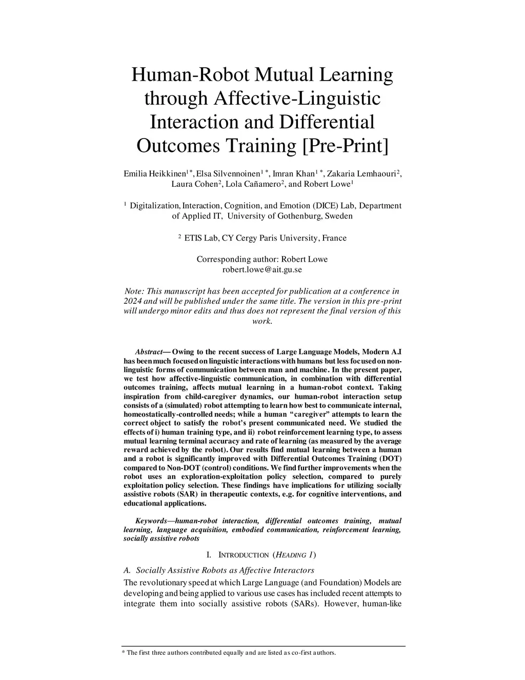 Owing to the recent success of Large Language Models, Modern A.I has been much focused on linguistic interactions with humans but less focused on non-linguistic forms of communication between man and machine. In the present paper, we test how affective-linguistic communication, in combination with differential outcomes training, affects mutual learning in a human-robot context. Taking inspiration from child-caregiver dynamics, our human-robot interaction setup consists of a (simulated) robot attempting to learn how best to communicate internal, homeostatically-controlled needs; while a human "caregiver" attempts to learn the correct object to satisfy the robot's present communicated need. We studied the effects of i) human training type, and ii) robot reinforcement learning type, to assess mutual learning terminal accuracy and rate of learning (as measured by the average reward achieved by the robot). Our results find mutual learning between a human and a robot is significantly improved with Differential Outcomes Training (DOT) compared to Non-DOT (control) conditions. We find further improvements when the robot uses an exploration-exploitation policy selection, compared to purely exploitation policy selection. These findings have implications for utilizing socially assistive robots (SAR) in therapeutic contexts, e.g. for cognitive interventions, and educational applications.