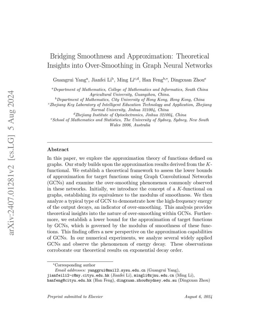 In this paper, we explore the approximation theory of functions defined on graphs. Our study builds upon the approximation results derived from the -functional. We establish a theoretical framework to assess the lower bounds of approximation for target functions using Graph Convolutional Networks (GCNs) and examine the over-smoothing phenomenon commonly observed in these networks. Initially, we introduce the concept of a -functional on graphs, establishing its equivalence to the modulus of smoothness. We then analyze a typical type of GCN to demonstrate how the high-frequency energy of the output decays, an indicator of over-smoothing. This analysis provides theoretical insights into the nature of over-smoothing within GCNs. Furthermore, we establish a lower bound for the approximation of target functions by GCNs, which is governed by the modulus of smoothness of these functions. This finding offers a new perspective on the approximation capabilities of GCNs. In our numerical experiments, we analyze several widely applied GCNs and observe the phenomenon of energy decay. These observations corroborate our theoretical results on exponential decay order.