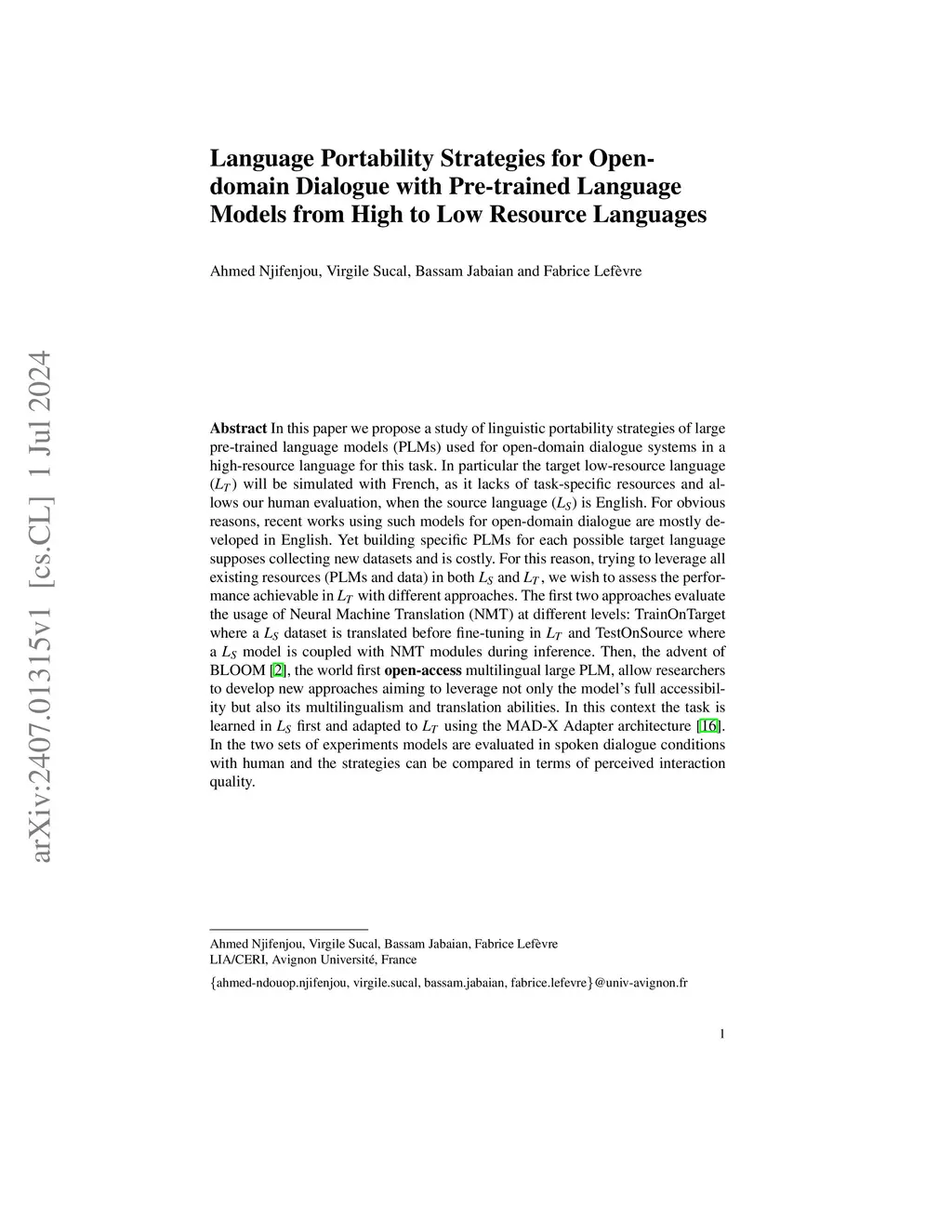 In this paper we propose a study of linguistic portability strategies of large pre-trained language models (PLMs) used for open-domain dialogue systems in a high-resource language for this task. In particular the target low-resource language (L_T) will be simulated with French, as it lacks of task-specific resources and allows our human evaluation, when the source language (L_S) is English. For obvious reasons, recent works using such models for open-domain dialogue are mostly developed in English. Yet building specific PLMs for each possible target language supposes collecting new datasets and is costly. For this reason, trying to leverage all existing resources (PLMs and data) in both L_S and L_T , we wish to assess the performance achievable in L_T with different approaches. The first two approaches evaluate the usage of Neural Machine Translation (NMT) at different levels: TrainOnTarget where a L_S dataset is translated before fine-tuning in L_T and TestOnSource where a L_S model is coupled with NMT modules during inference. Then, the advent of BLOOM [2], the world first open-access multilingual large PLM, allow researchers to develop new approaches aiming to leverage not only the model's full accessibility but also its multilingualism and translation abilities. In this context the task is learned in L_S first and adapted to L_T using the MAD-X Adapter architecture [16]. In the two sets of experiments models are evaluated in spoken dialogue conditions with human and the strategies can be compared in terms of perceived interaction quality.