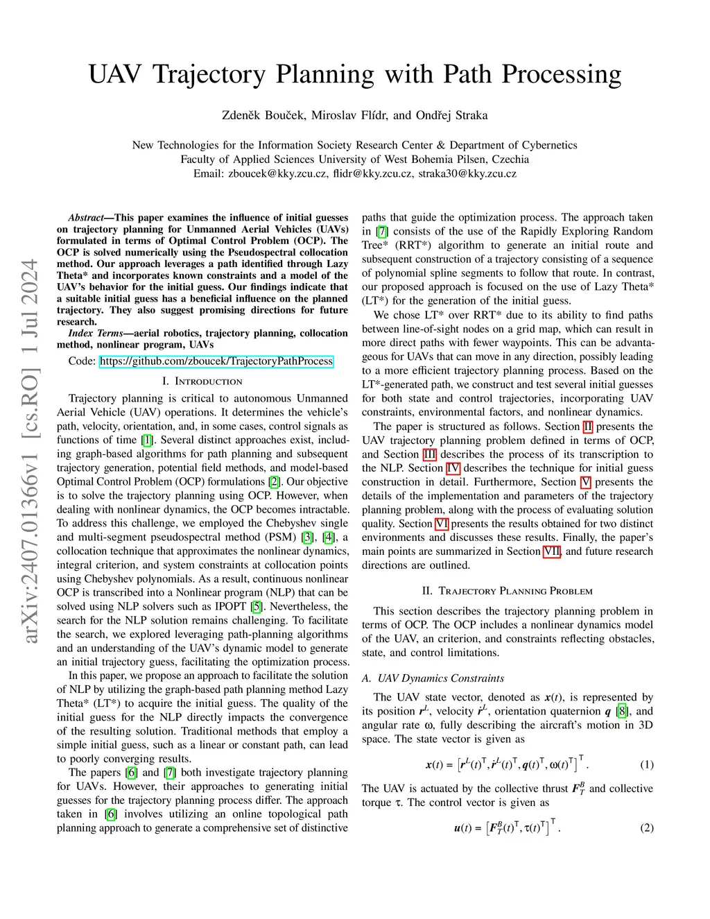 This paper examines the influence of initial guesses on trajectory planning for Unmanned Aerial Vehicles (UAVs) formulated in terms of Optimal Control Problem (OCP). The OCP is solved numerically using the Pseudospectral collocation method. Our approach leverages a path identified through Lazy Theta* and incorporates known constraints and a model of the UAV's behavior for the initial guess. Our findings indicate that a suitable initial guess has a beneficial influence on the planned trajectory. They also suggest promising directions for future research.