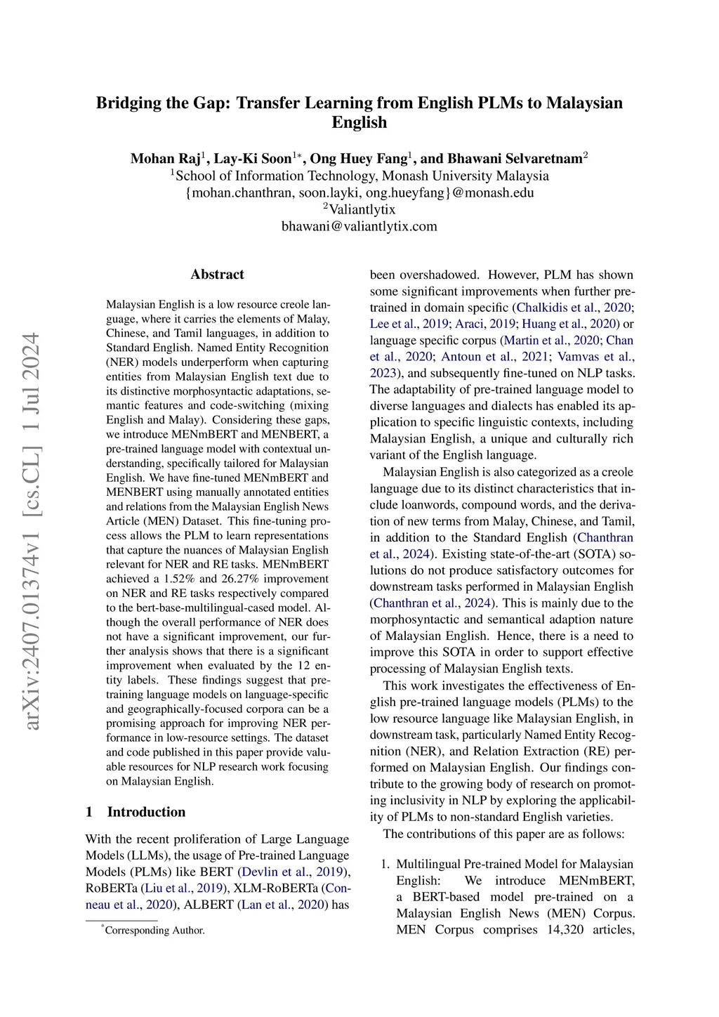 Malaysian English is a low resource creole language, where it carries the elements of Malay, Chinese, and Tamil languages, in addition to Standard English. Named Entity Recognition (NER) models underperform when capturing entities from Malaysian English text due to its distinctive morphosyntactic adaptations, semantic features and code-switching (mixing English and Malay). Considering these gaps, we introduce MENmBERT and MENBERT, a pre-trained language model with contextual understanding, specifically tailored for Malaysian English. We have fine-tuned MENmBERT and MENBERT using manually annotated entities and relations from the Malaysian English News Article (MEN) Dataset. This fine-tuning process allows the PLM to learn representations that capture the nuances of Malaysian English relevant for NER and RE tasks. MENmBERT achieved a 1.52\% and 26.27\% improvement on NER and RE tasks respectively compared to the bert-base-multilingual-cased model. Although the overall performance of NER does not have a significant improvement, our further analysis shows that there is a significant improvement when evaluated by the 12 entity labels. These findings suggest that pre-training language models on language-specific and geographically-focused corpora can be a promising approach for improving NER performance in low-resource settings. The dataset and code published in this paper provide valuable resources for NLP research work focusing on Malaysian English.