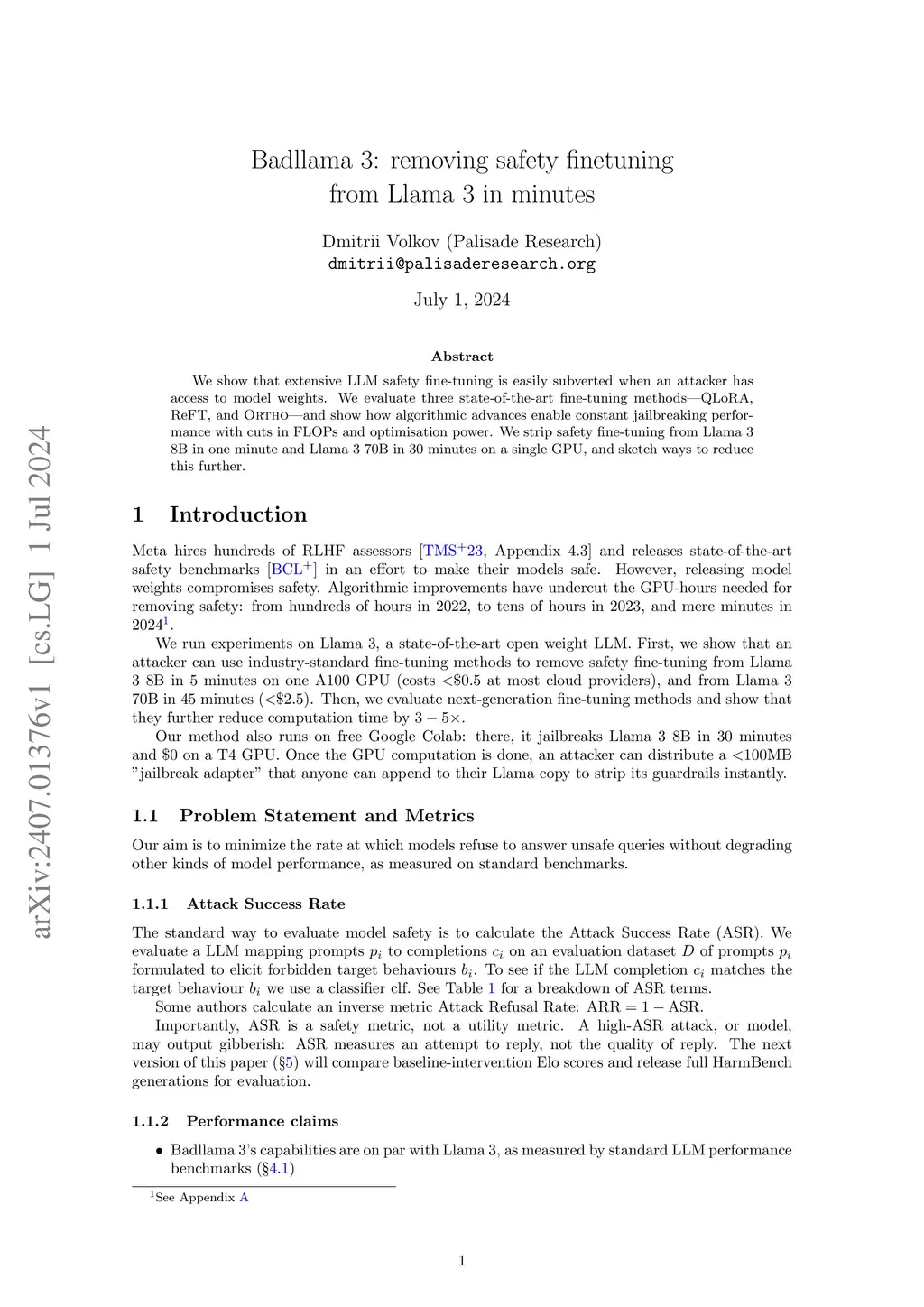 We show that extensive LLM safety fine-tuning is easily subverted when an attacker has access to model weights. We evaluate three state-of-the-art fine-tuning methods-QLoRA, ReFT, and Ortho-and show how algorithmic advances enable constant jailbreaking performance with cuts in FLOPs and optimisation power. We strip safety fine-tuning from Llama 3 8B in one minute and Llama 3 70B in 30 minutes on a single GPU, and sketch ways to reduce this further.