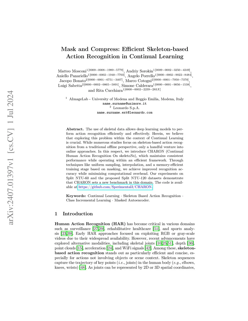 The use of skeletal data allows deep learning models to perform action recognition efficiently and effectively. Herein, we believe that exploring this problem within the context of Continual Learning is crucial. While numerous studies focus on skeleton-based action recognition from a traditional offline perspective, only a handful venture into online approaches. In this respect, we introduce CHARON (Continual Human Action Recognition On skeletoNs), which maintains consistent performance while operating within an efficient framework. Through techniques like uniform sampling, interpolation, and a memory-efficient training stage based on masking, we achieve improved recognition accuracy while minimizing computational overhead. Our experiments on Split NTU-60 and the proposed Split NTU-120 datasets demonstrate that CHARON sets a new benchmark in this domain. The code is available at https://github.com/Sperimental3/CHARON.