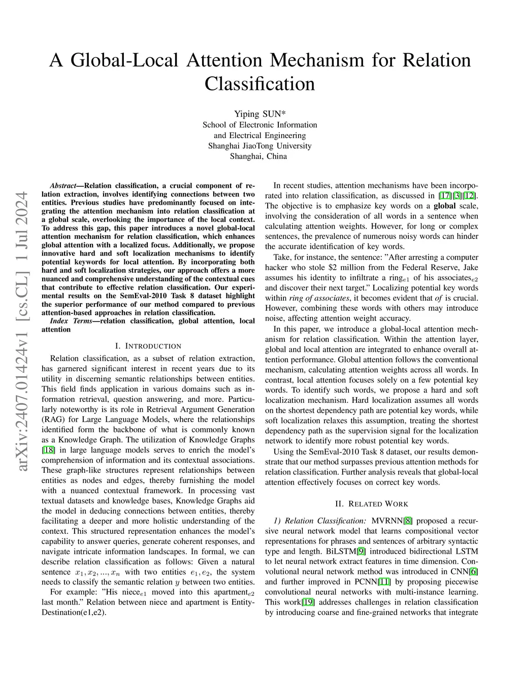 Relation classification, a crucial component of relation extraction, involves identifying connections between two entities. Previous studies have predominantly focused on integrating the attention mechanism into relation classification at a global scale, overlooking the importance of the local context. To address this gap, this paper introduces a novel global-local attention mechanism for relation classification, which enhances global attention with a localized focus. Additionally, we propose innovative hard and soft localization mechanisms to identify potential keywords for local attention. By incorporating both hard and soft localization strategies, our approach offers a more nuanced and comprehensive understanding of the contextual cues that contribute to effective relation classification. Our experimental results on the SemEval-2010 Task 8 dataset highlight the superior performance of our method compared to previous attention-based approaches in relation classification.