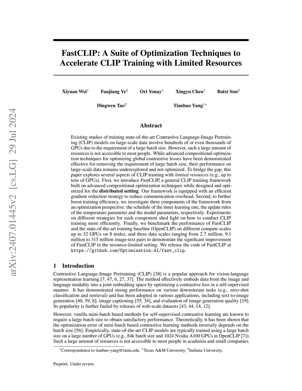 Existing studies of training state-of-the-art Contrastive Language-Image Pretraining (CLIP) models on large-scale data involve hundreds of or even thousands of GPUs due to the requirement of a large batch size. However, such a large amount of resources is not accessible to most people. While advanced compositional optimization techniques for optimizing global contrastive losses have been demonstrated effective for removing the requirement of large batch size, their performance on large-scale data remains underexplored and not optimized. To bridge the gap, this paper explores several aspects of CLIP training with limited resources (e.g., up to tens of GPUs). First, we introduce FastCLIP, a general CLIP training framework built on advanced compositional optimization techniques while designed and optimized for the distributed setting. Our framework is equipped with an efficient gradient reduction strategy to reduce communication overhead. Second, to further boost training efficiency, we investigate three components of the framework from an optimization perspective: the schedule of the inner learning rate, the update rules of the temperature parameter and the model parameters, respectively. Experiments on different strategies for each component shed light on how to conduct CLIP training more efficiently. Finally, we benchmark the performance of FastCLIP and the state-of-the-art training baseline (OpenCLIP) on different compute scales up to 32 GPUs on 8 nodes, and three data scales ranging from 2.7 million, 9.1 million to 315 million image-text pairs to demonstrate the significant improvement of FastCLIP in the resource-limited setting. We release the code of FastCLIP at https://github.com/Optimization-AI/fast_clip .
