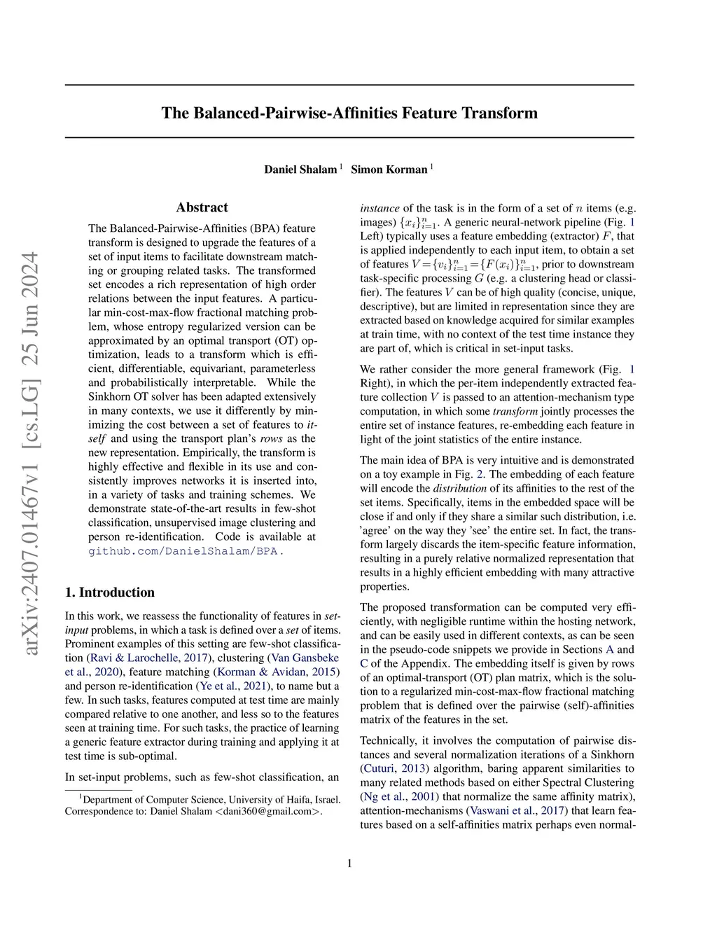 The Balanced-Pairwise-Affinities (BPA) feature transform is designed to upgrade the features of a set of input items to facilitate downstream matching or grouping related tasks. The transformed set encodes a rich representation of high order relations between the input features. A particular min-cost-max-flow fractional matching problem, whose entropy regularized version can be approximated by an optimal transport (OT) optimization, leads to a transform which is efficient, differentiable, equivariant, parameterless and probabilistically interpretable. While the Sinkhorn OT solver has been adapted extensively in many contexts, we use it differently by minimizing the cost between a set of features to and using the transport plan's as the new representation. Empirically, the transform is highly effective and flexible in its use and consistently improves networks it is inserted into, in a variety of tasks and training schemes. We demonstrate state-of-the-art results in few-shot classification, unsupervised image clustering and person re-identification. Code is available at \url{github.com/DanielShalam/BPA}.